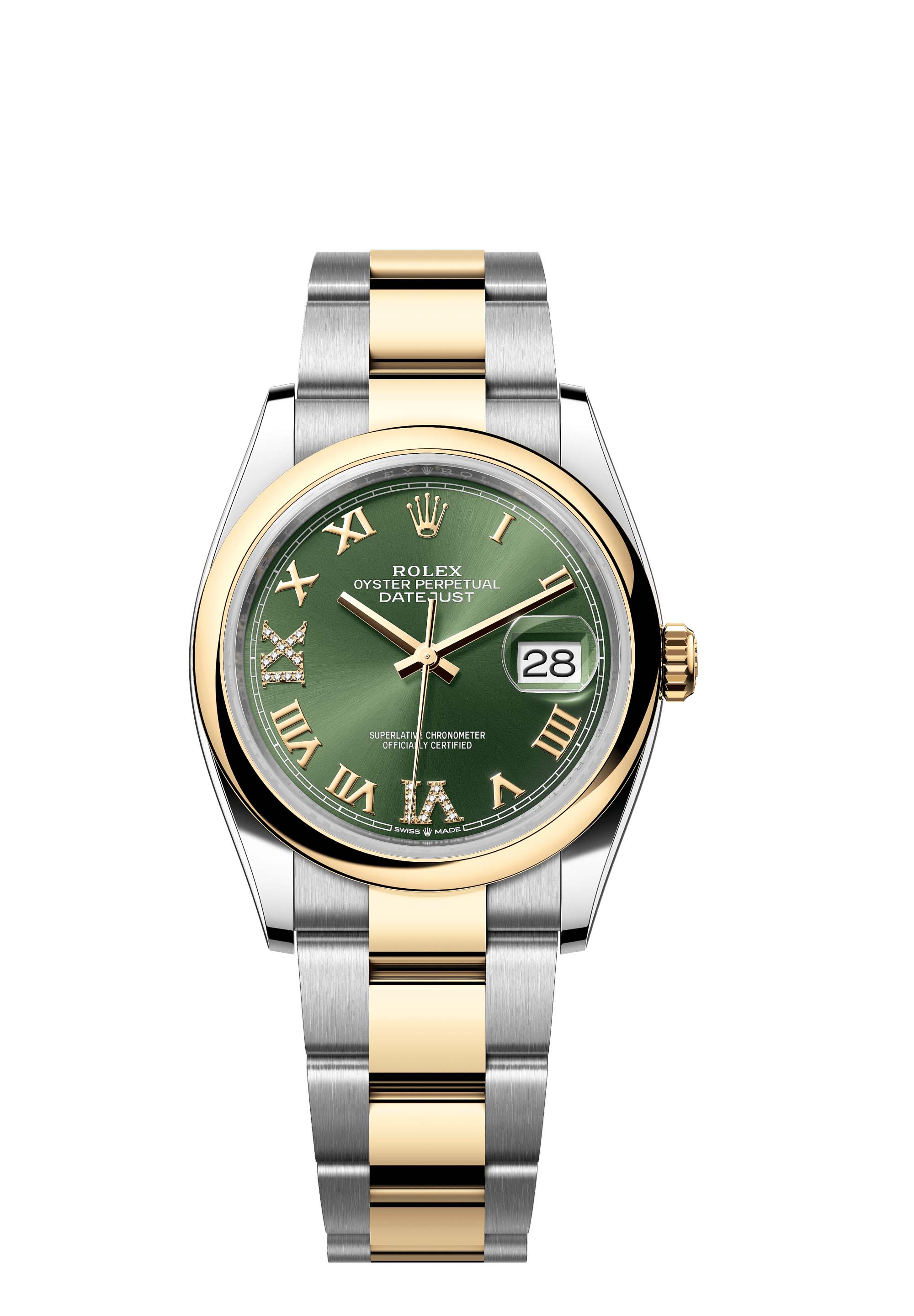 This Oyster Perpetual Datejust 36 in Oystersteel and yellow gold features an olive-green, diamond-set dial and an Oyster bracelet.