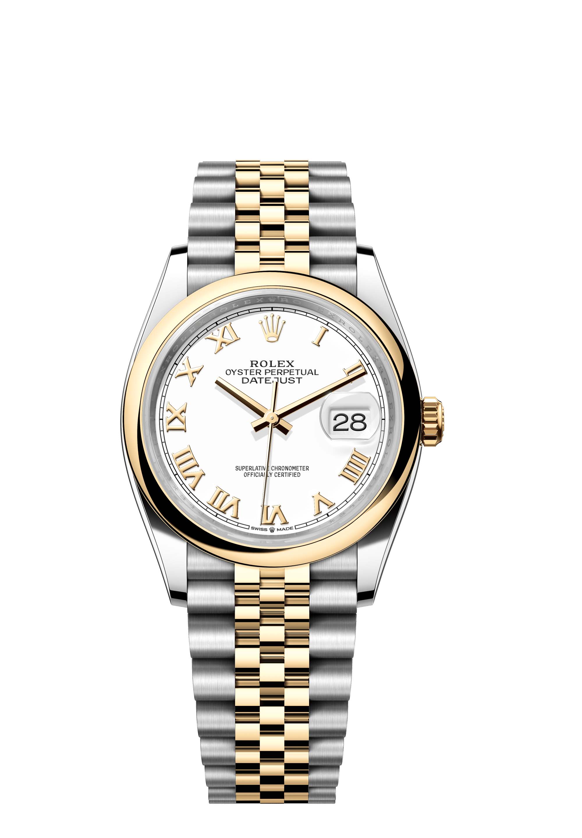 This Oyster Perpetual Datejust 36 in Oystersteel and yellow gold features a white dial and a Jubilee bracelet.