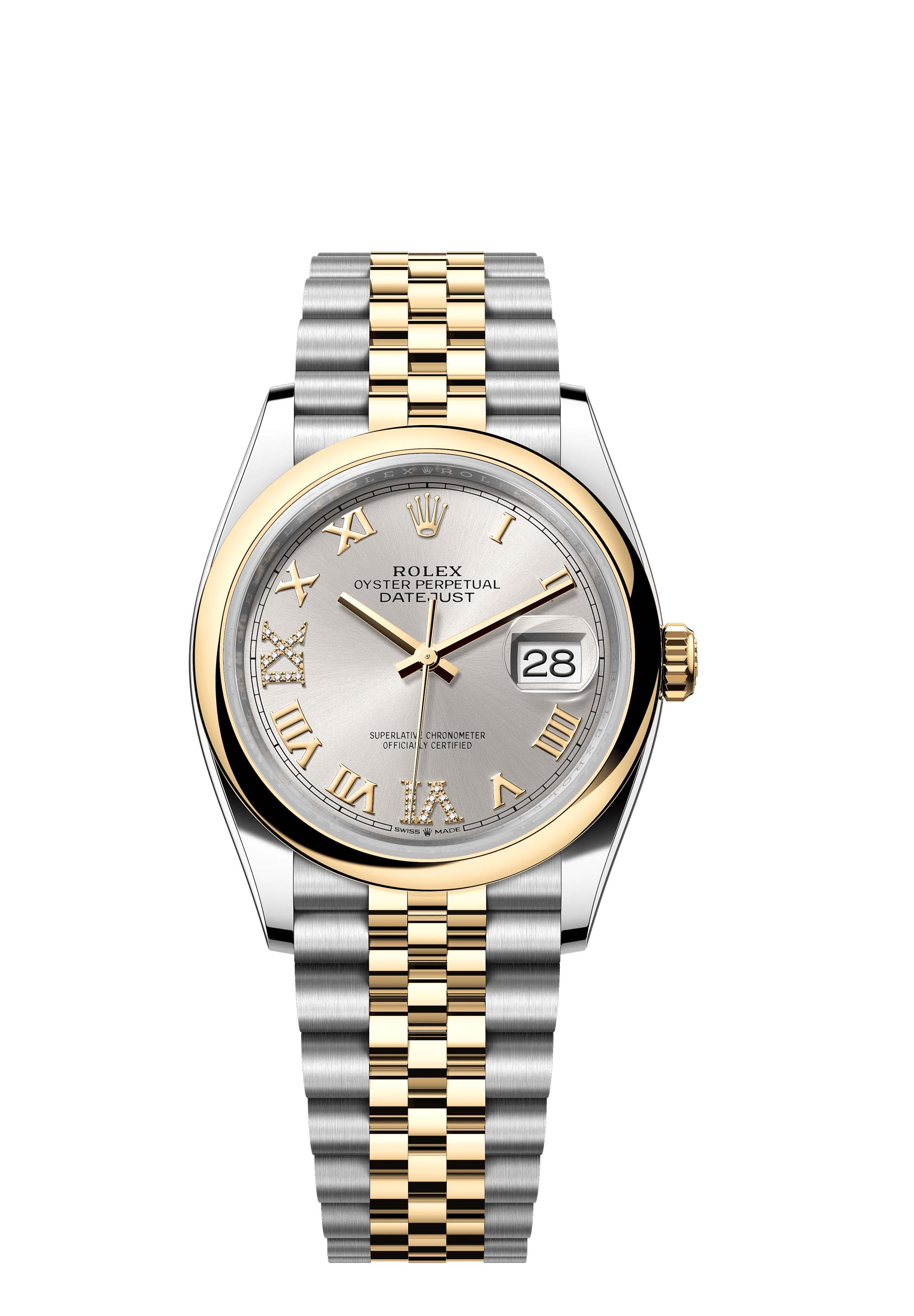This Oyster Perpetual Datejust 36 in Oystersteel and yellow gold features a silver, diamond-set dial and a Jubilee bracelet.