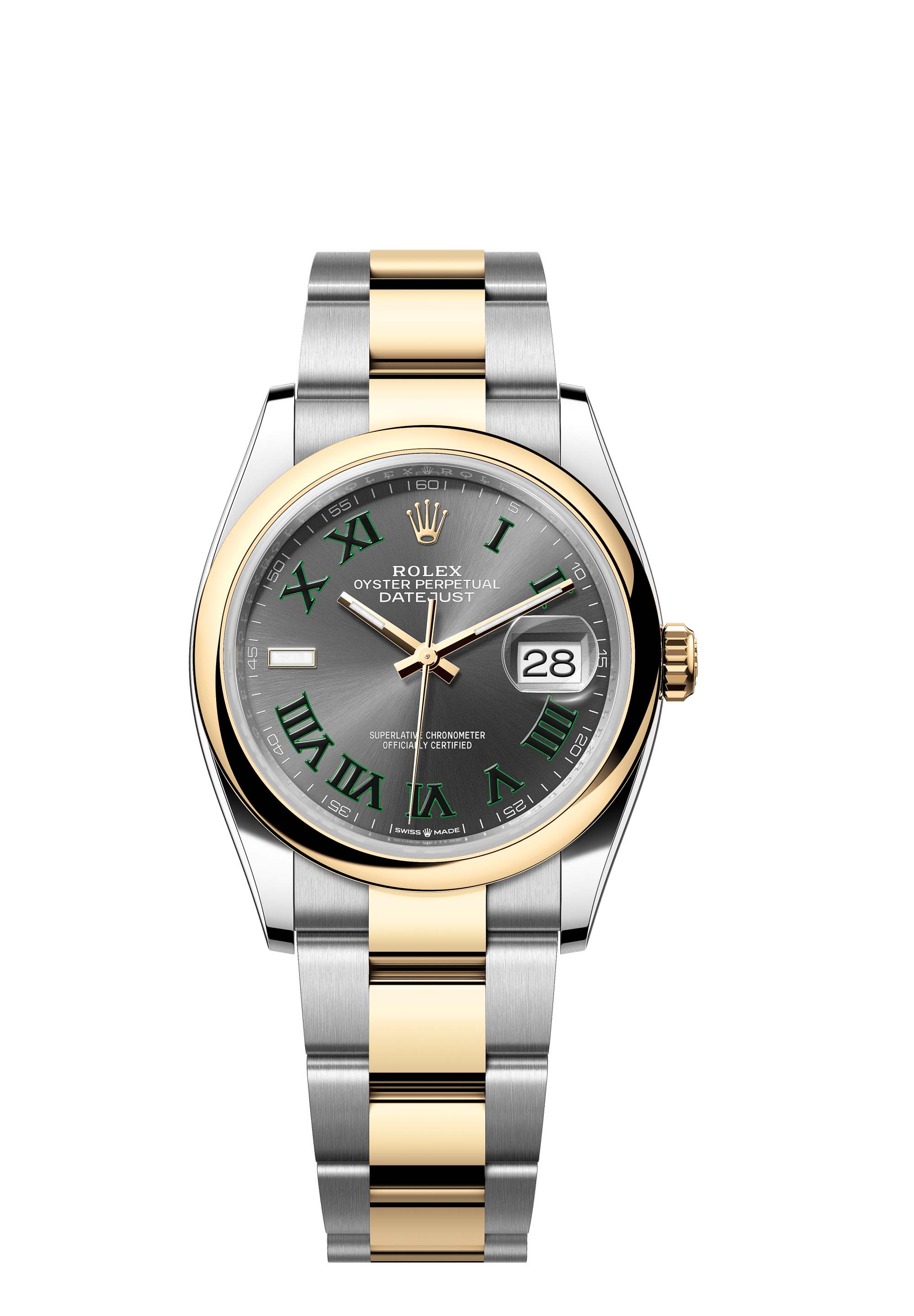 This Oyster Perpetual Datejust 36 in Oystersteel and yellow gold features a slate dial and an Oyster bracelet.