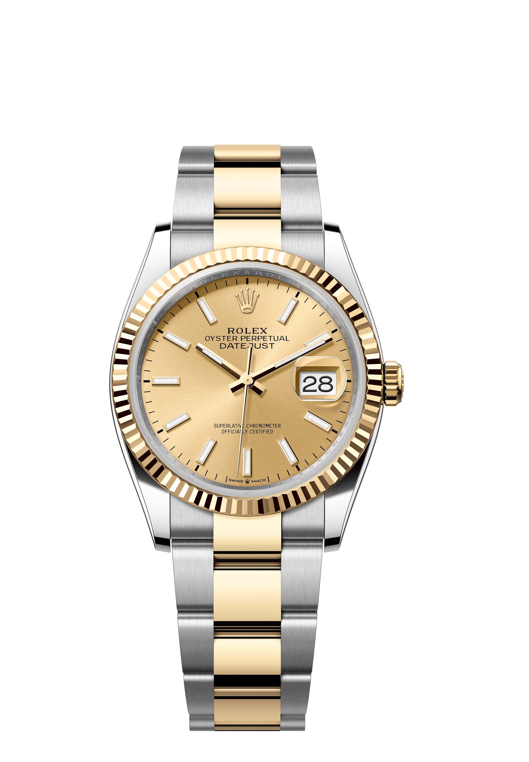This Oyster Perpetual Datejust 36 in Oystersteel and yellow gold features a champagne-colour dial and an Oyster bracelet.
