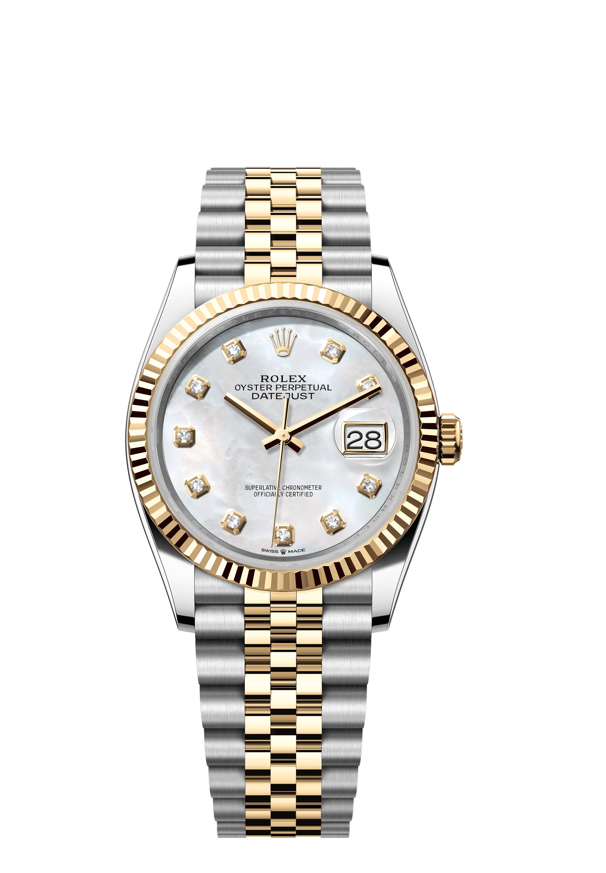 This Oyster Perpetual Datejust 36 in Oystersteel and yellow gold features a white mother-of-pearl, diamond-set dial and a Jubilee bracelet.