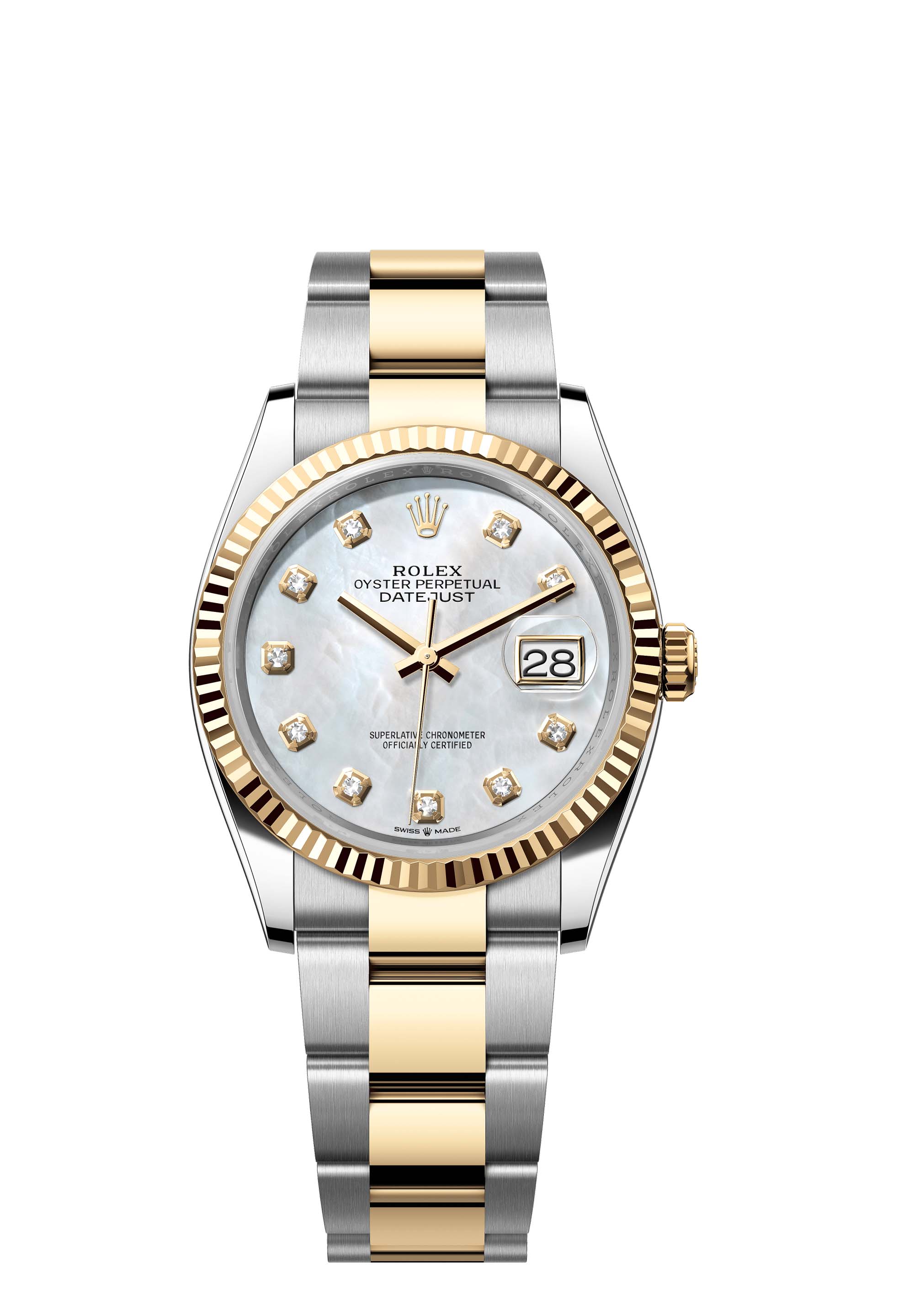 This Oyster Perpetual Datejust 36 in Oystersteel and yellow gold features a white mother-of-pearl, diamond-set dial and an Oyster bracelet.