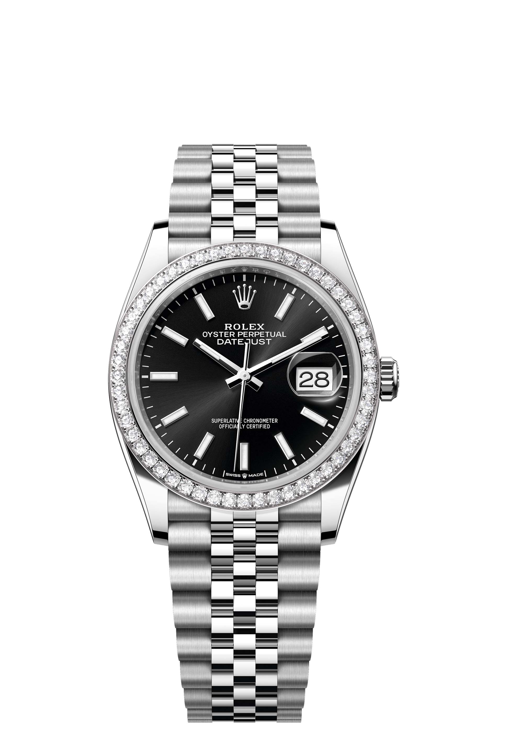This Oyster Perpetual Datejust 36 in Oystersteel and white gold features a bright black dial and a Jubilee bracelet.