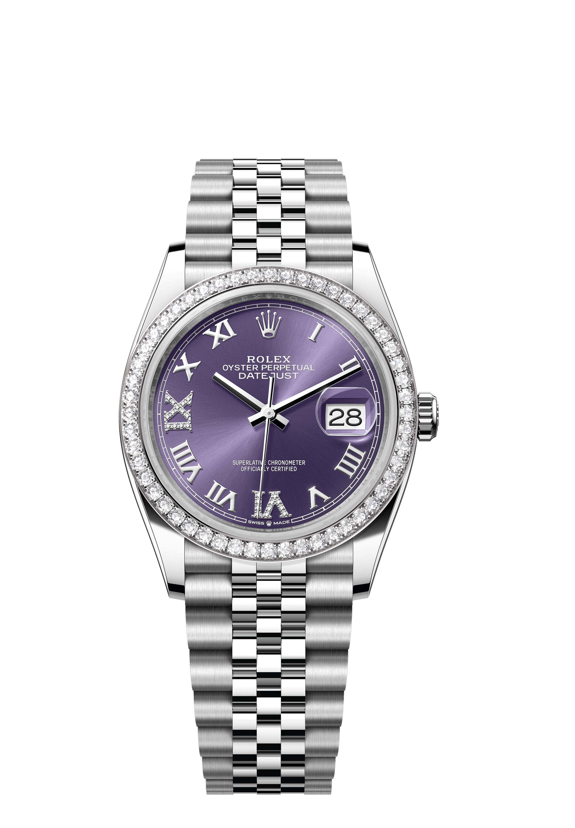 This Oyster Perpetual Datejust 36 in Oystersteel and white gold features an aubergine, diamond-set dial and a Jubilee bracelet.