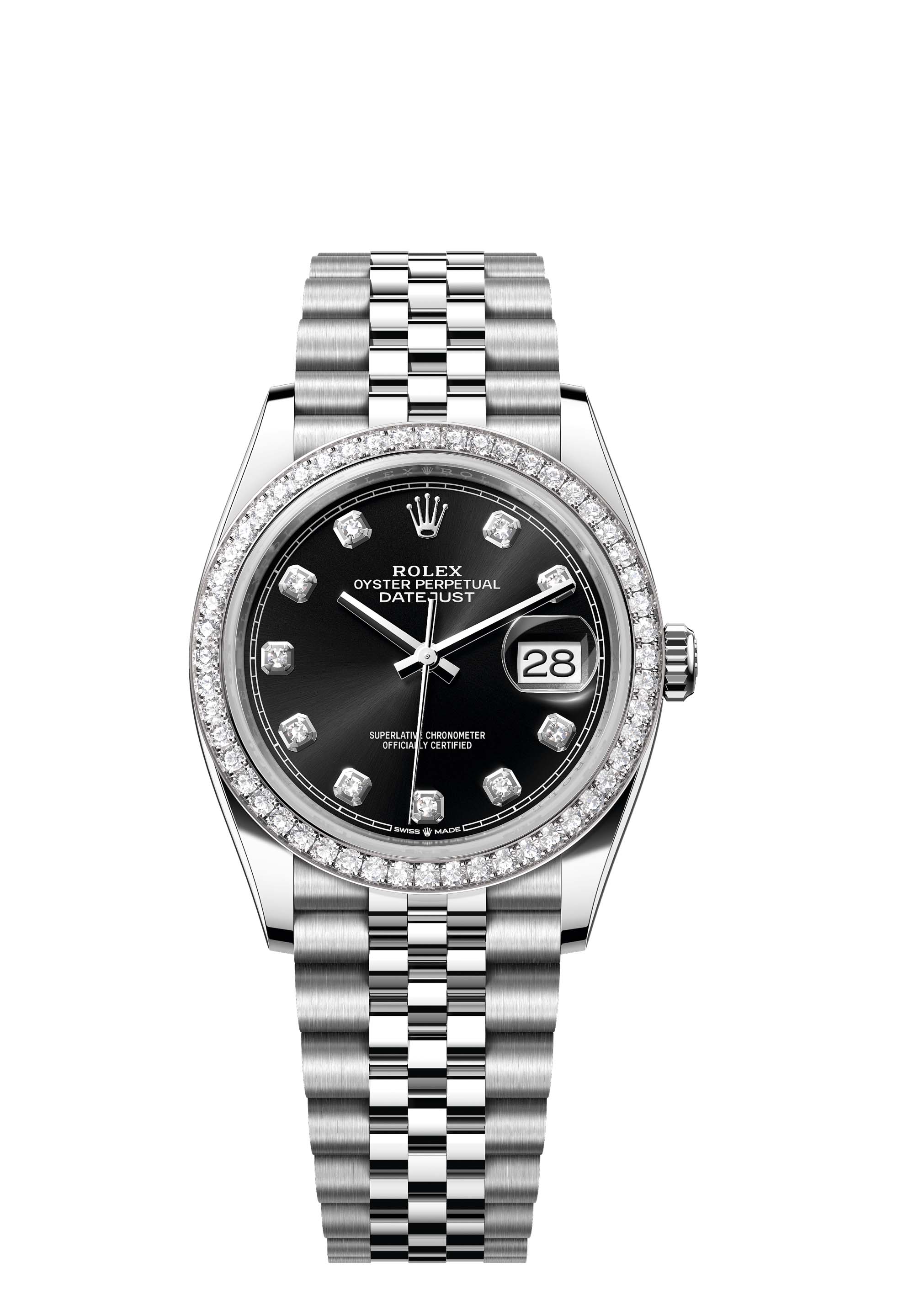 This Oyster Perpetual Datejust 36 in Oystersteel and white gold features a bright black, diamond-set dial and a Jubilee bracelet.