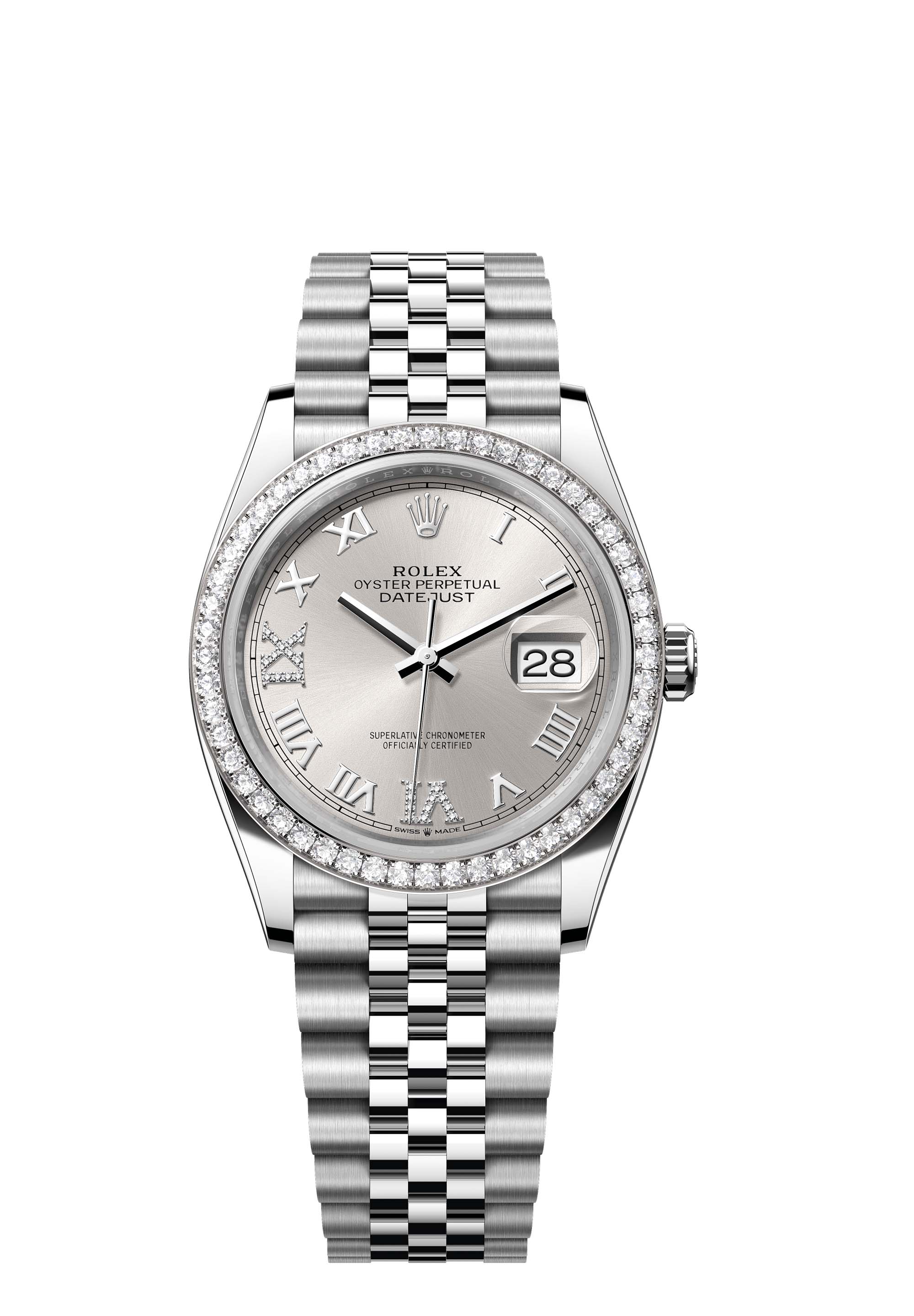 This Oyster Perpetual Datejust 36 in Oystersteel and white gold features a silver, diamond-set dial and a Jubilee bracelet.
