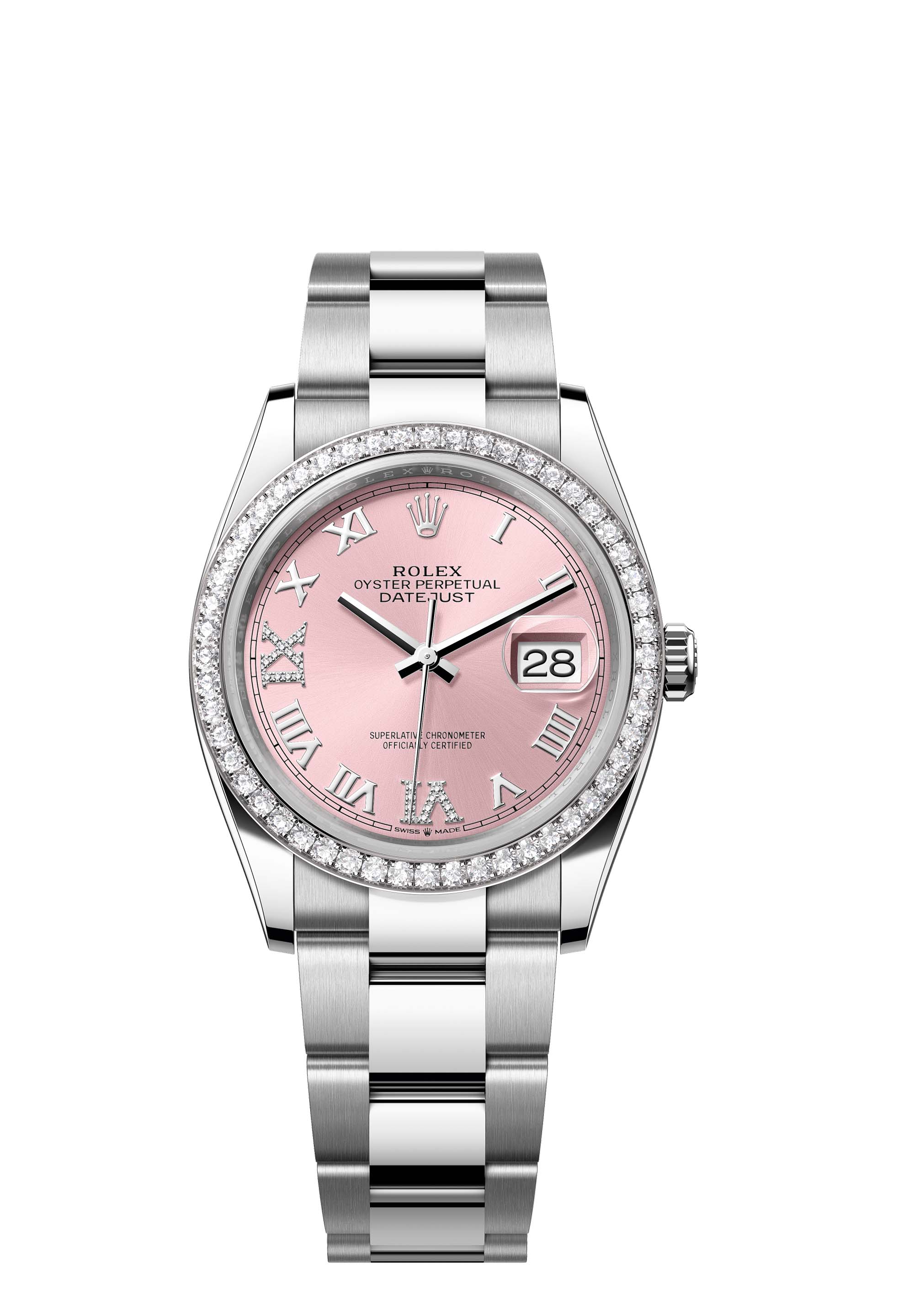 This Oyster Perpetual Datejust 36 in Oystersteel and white gold features a pink, diamond-set dial and an Oyster bracelet.