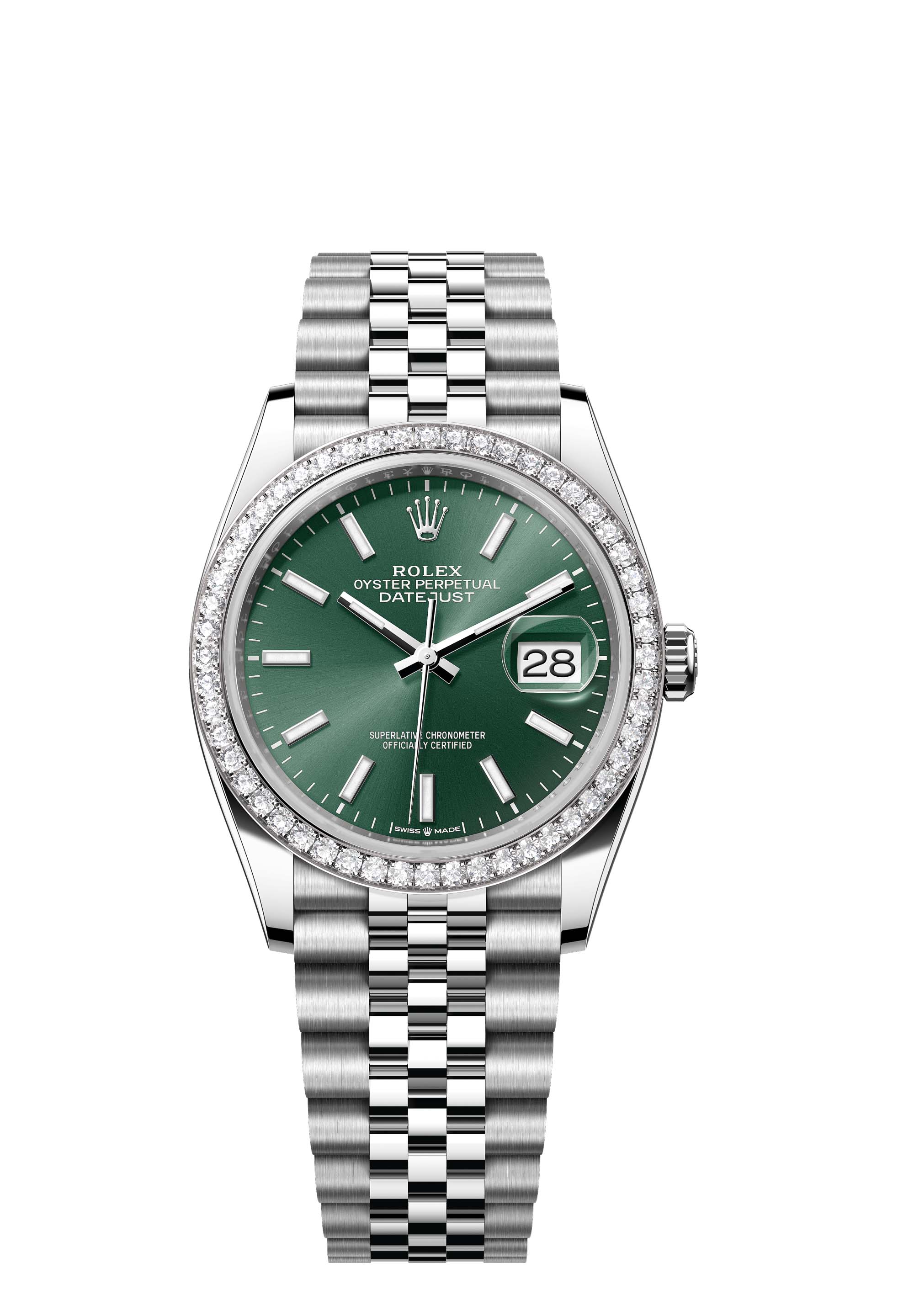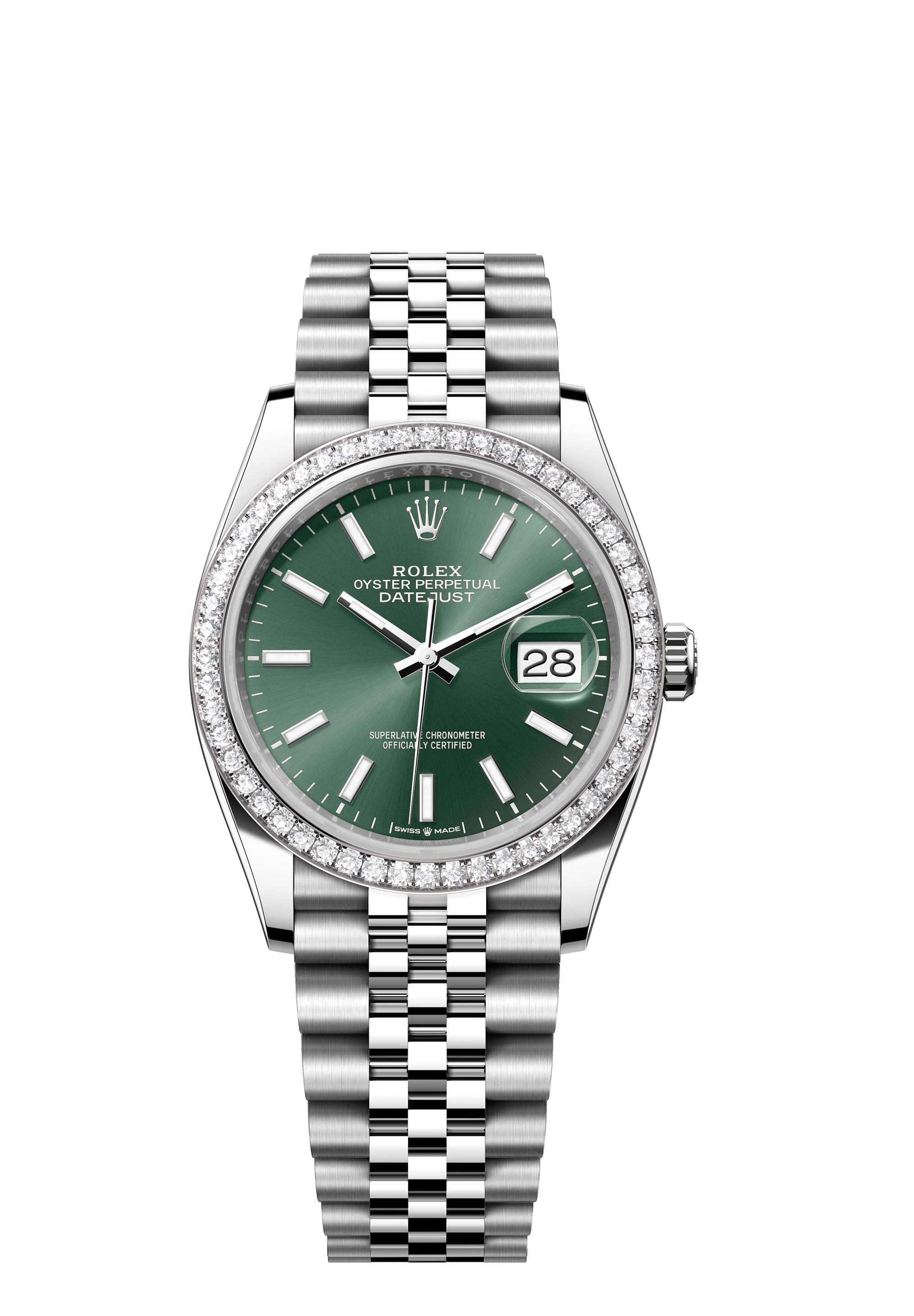 This Oyster Perpetual Datejust 36 in Oystersteel and white gold features a mint green dial and a Jubilee bracelet.