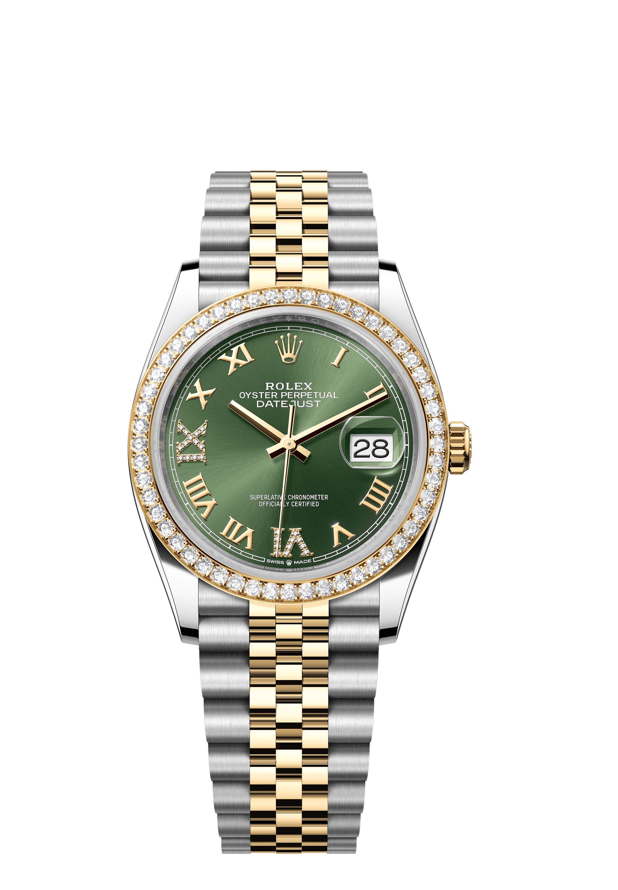 This Oyster Perpetual Datejust 36 in Oystersteel and yellow gold features an olive-green, diamond-set dial and a Jubilee bracelet.