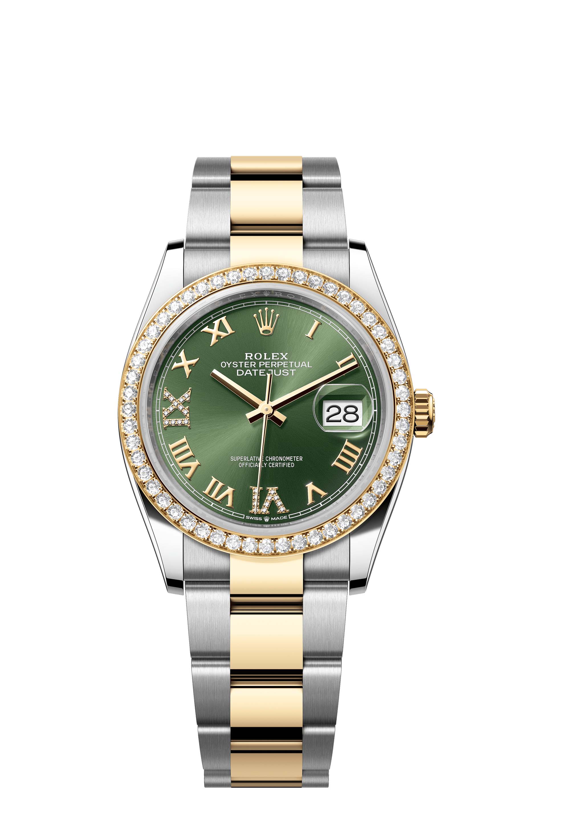 This Oyster Perpetual Datejust 36 in Oystersteel and yellow gold features an olive-green, diamond-set dial and an Oyster bracelet.
