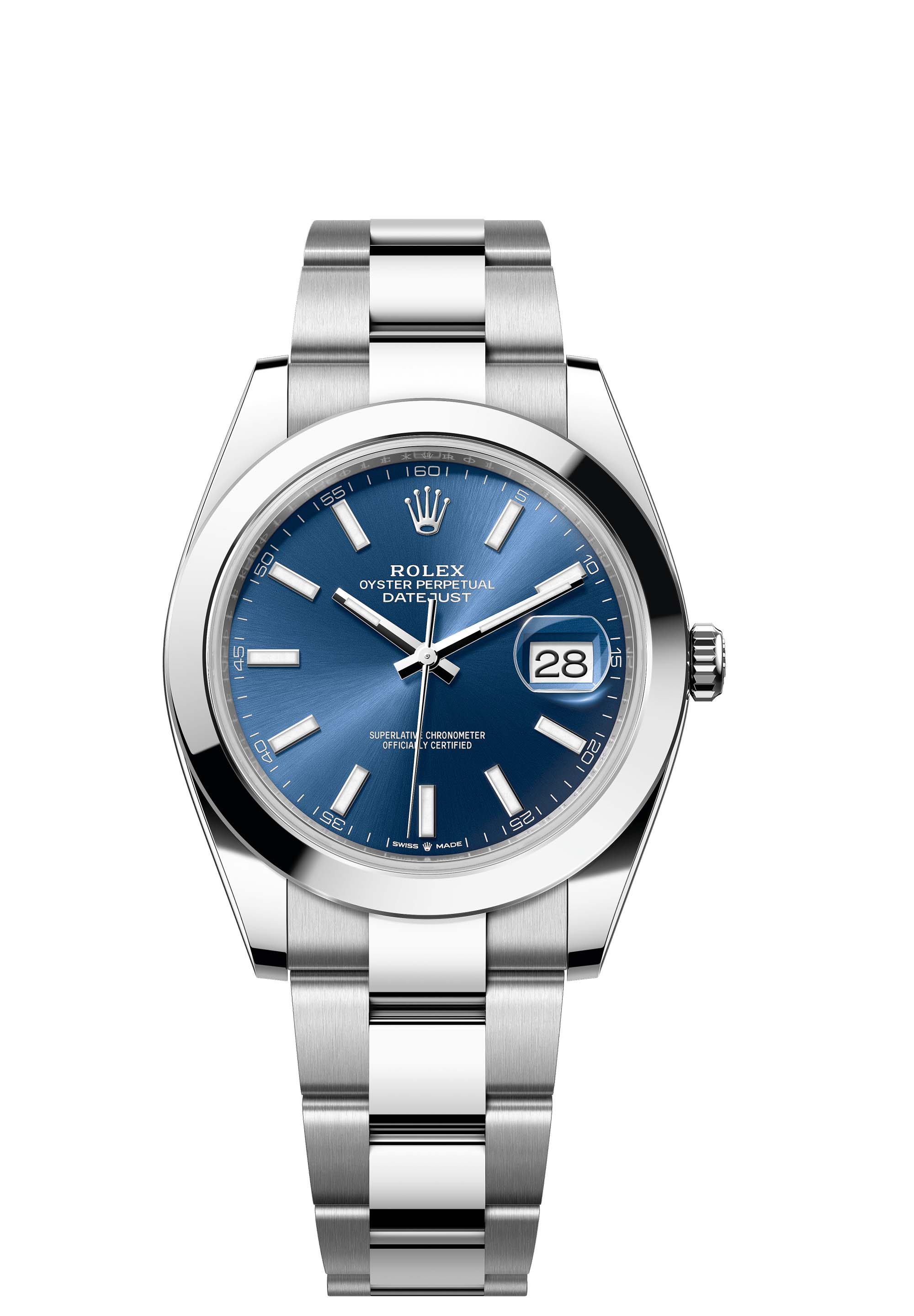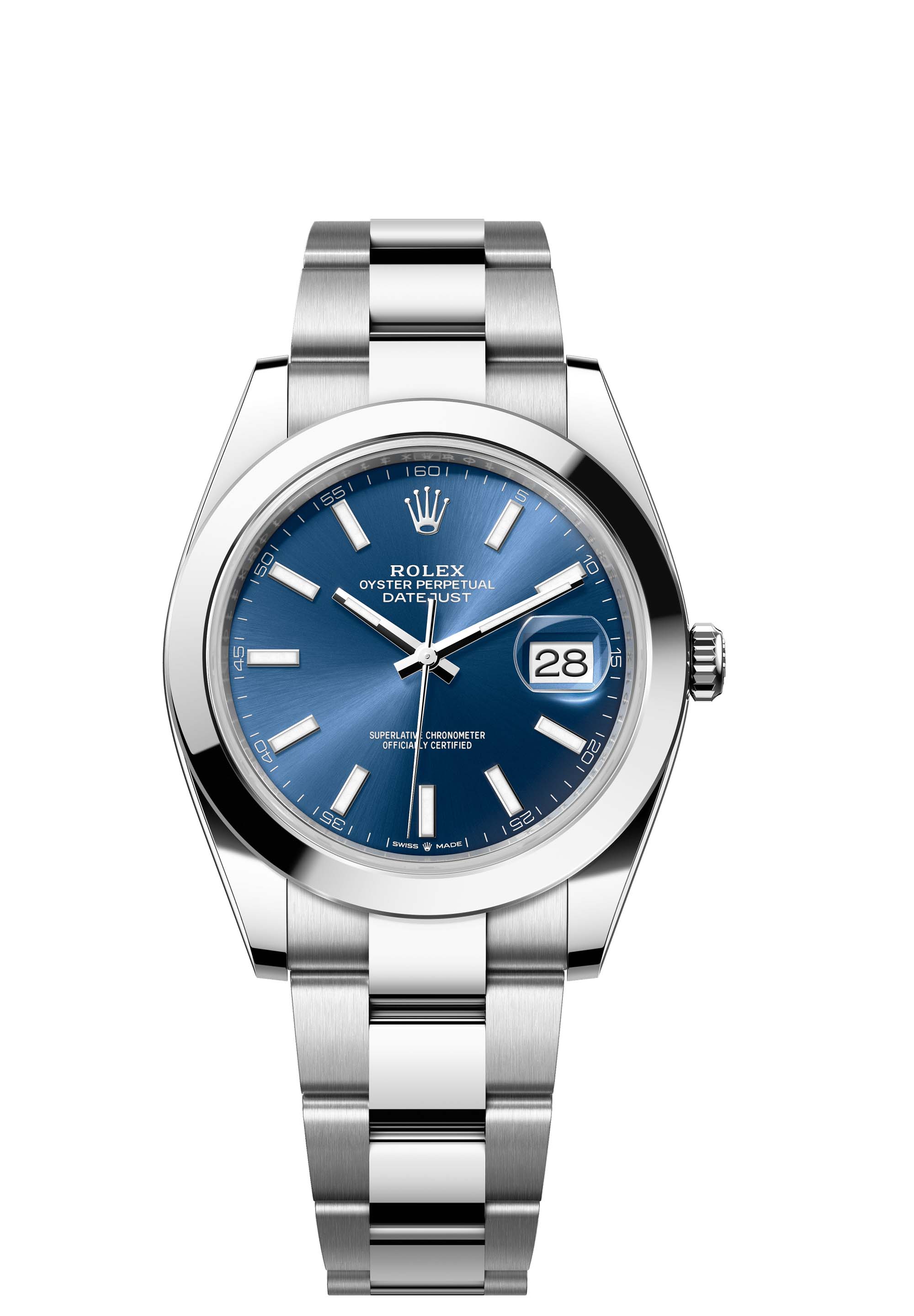 This Oyster Perpetual Datejust 41 in Oystersteel features a bright blue dial and an Oyster bracelet.