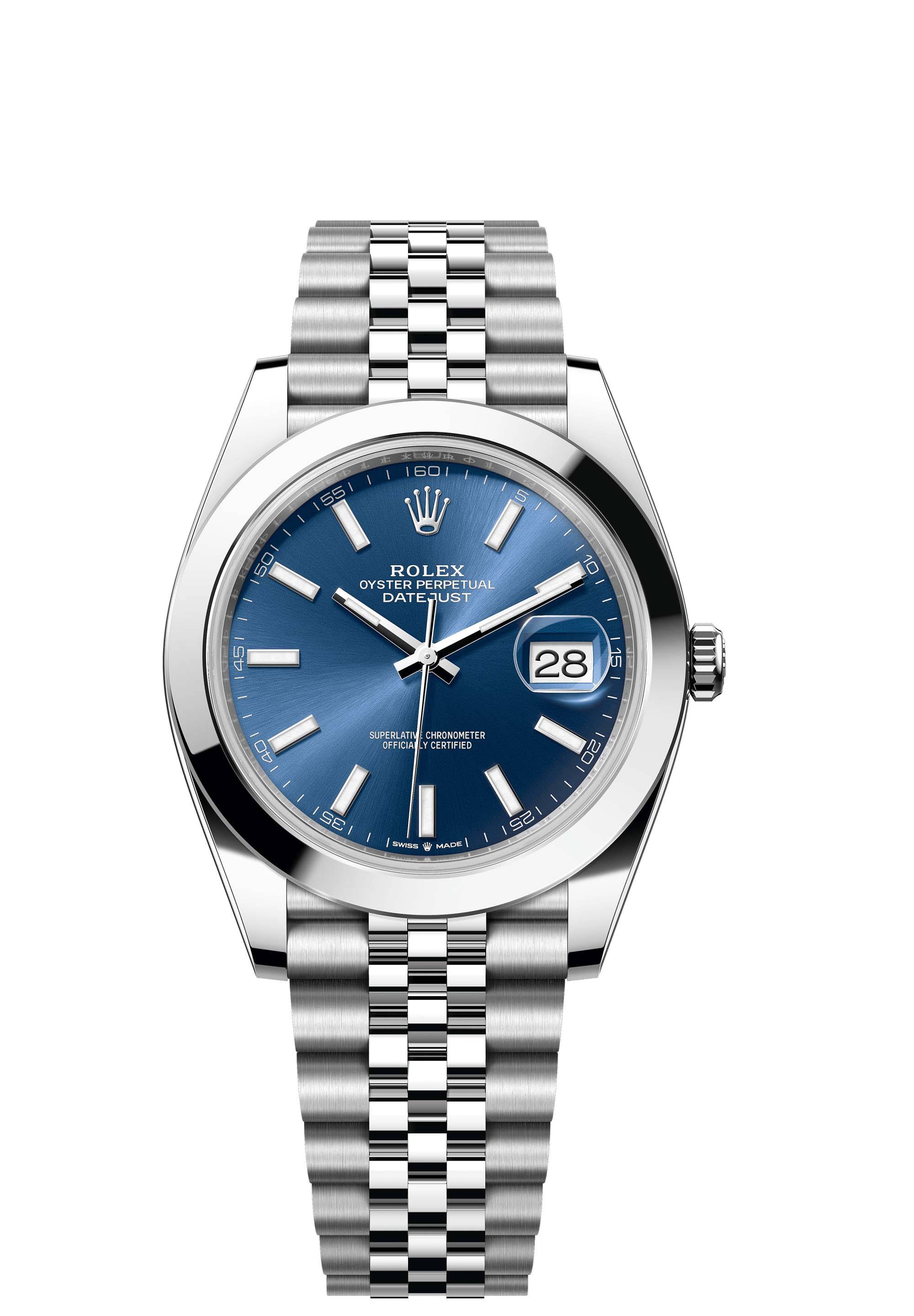 This Oyster Perpetual Datejust 41 in Oystersteel features a bright blue dial and a Jubilee bracelet.