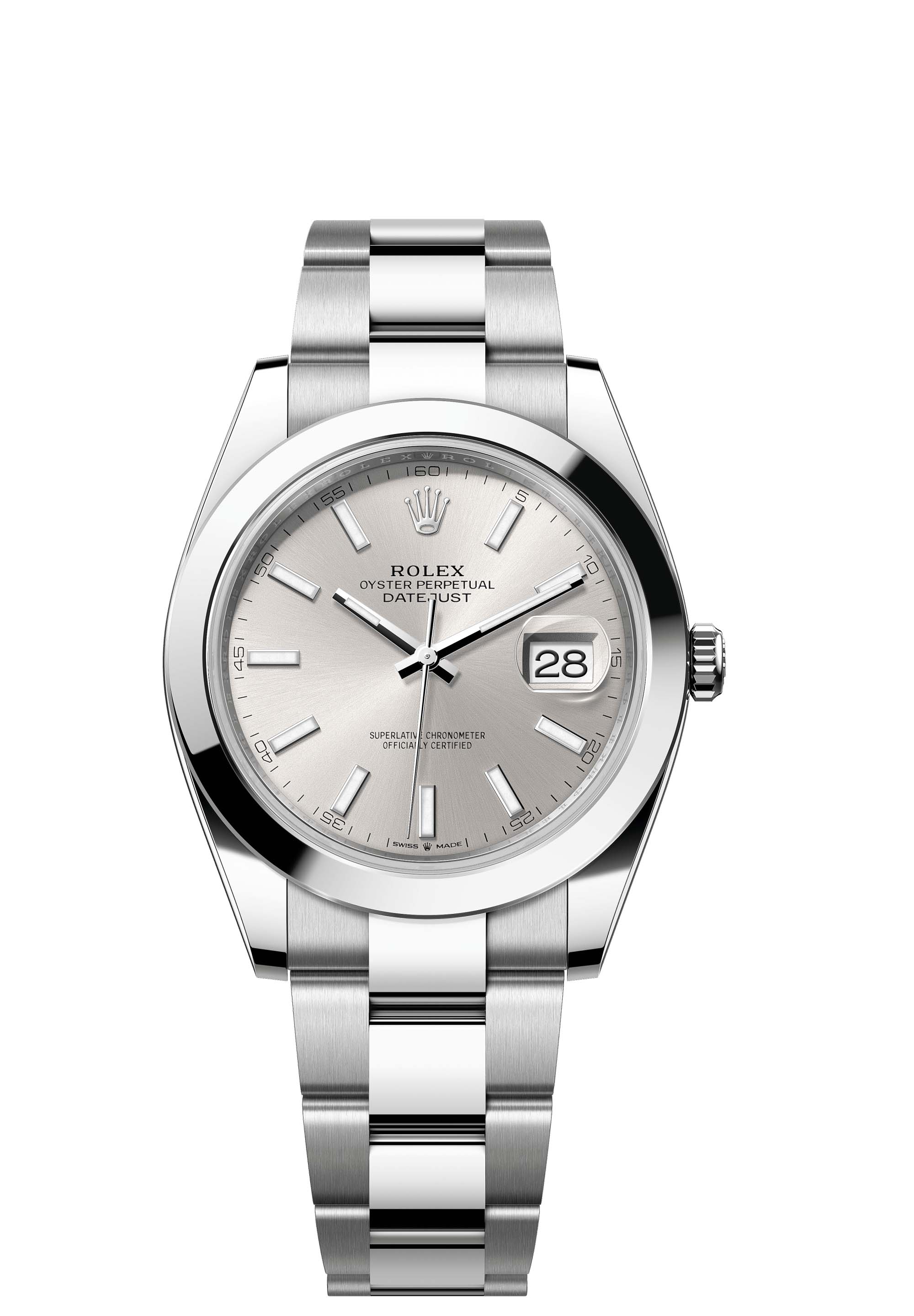 This Oyster Perpetual Datejust 41 in Oystersteel features a silver dial and an Oyster bracelet.