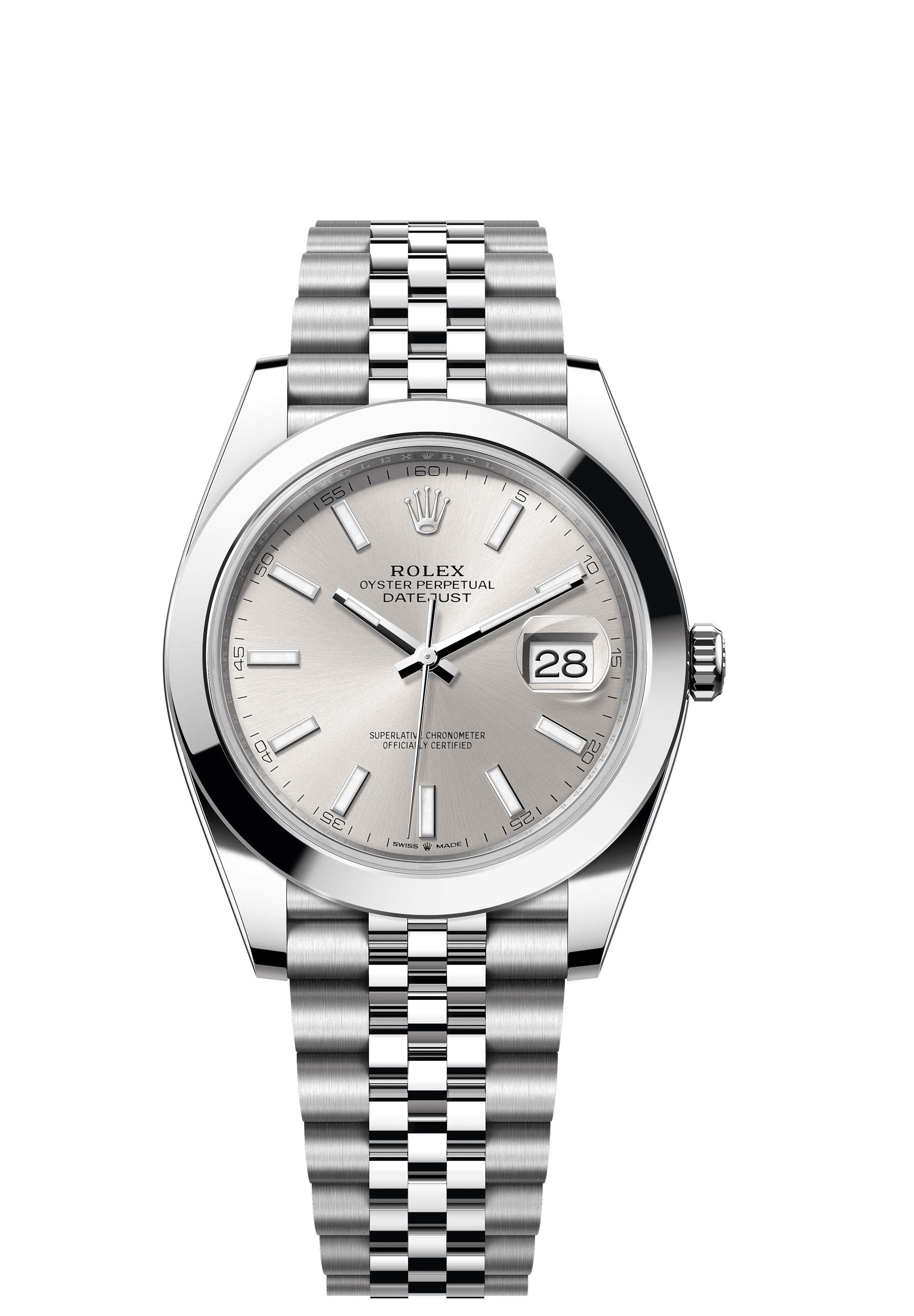 This Oyster Perpetual Datejust 41 in Oystersteel features a silver dial and a Jubilee bracelet.