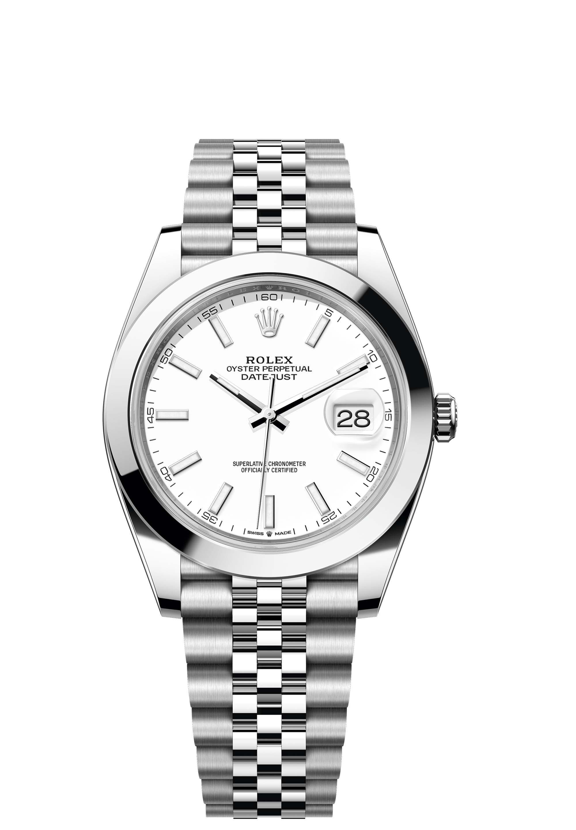 This Oyster Perpetual Datejust 41 in Oystersteel features a white dial and a Jubilee bracelet.