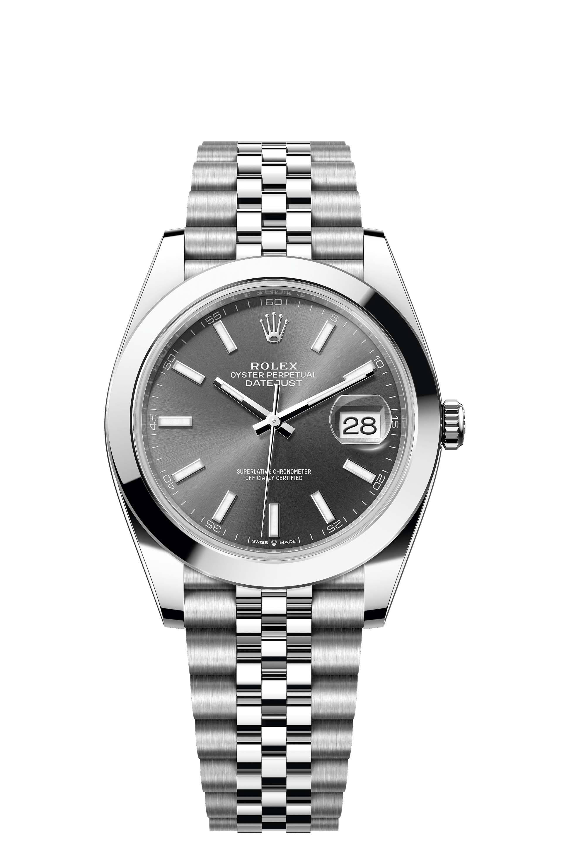 This Oyster Perpetual Datejust 41 in Oystersteel features a slate dial and a Jubilee bracelet.