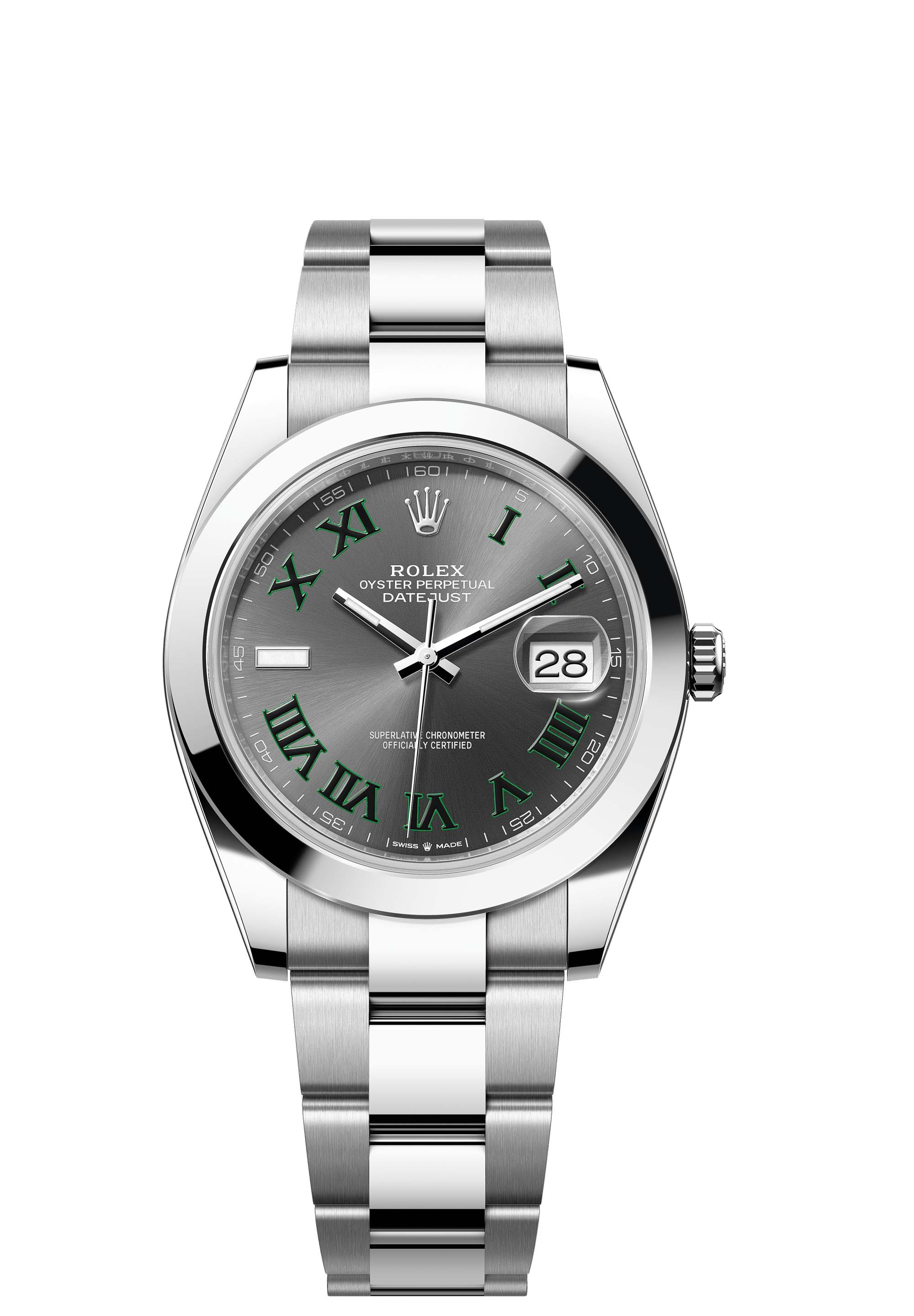 This Oyster Perpetual Datejust 41 in Oystersteel features a slate dial and an Oyster bracelet.