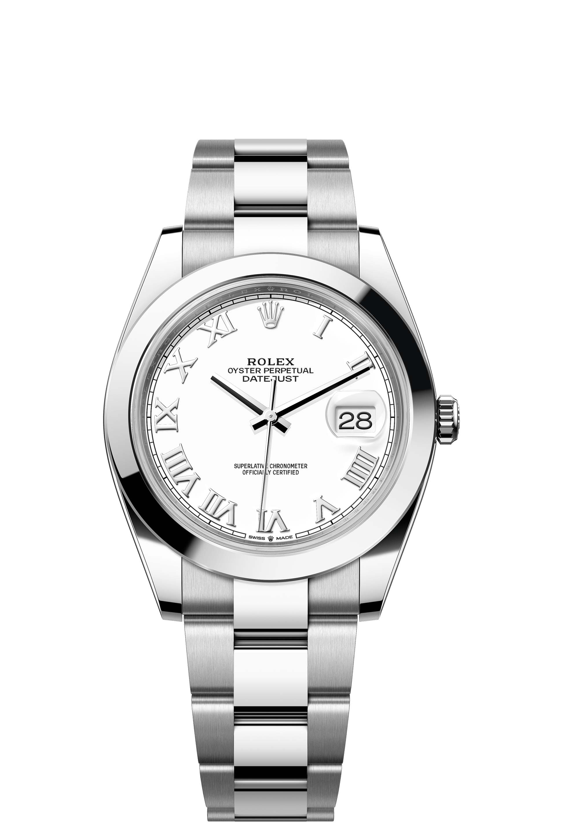 This Oyster Perpetual Datejust 41 in Oystersteel features a white dial and an Oyster bracelet.