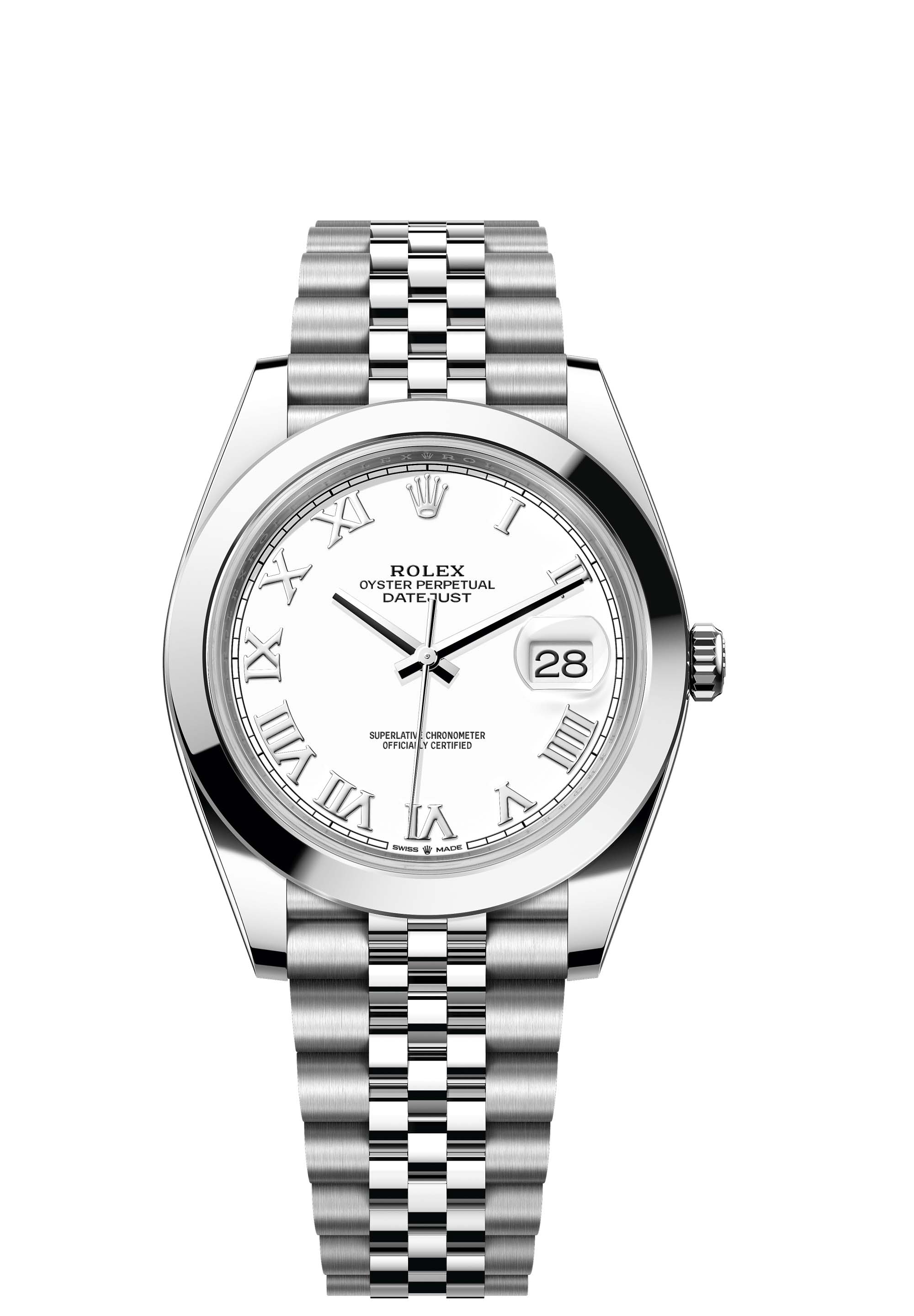 This Oyster Perpetual Datejust 41 in Oystersteel features a white dial and a Jubilee bracelet.