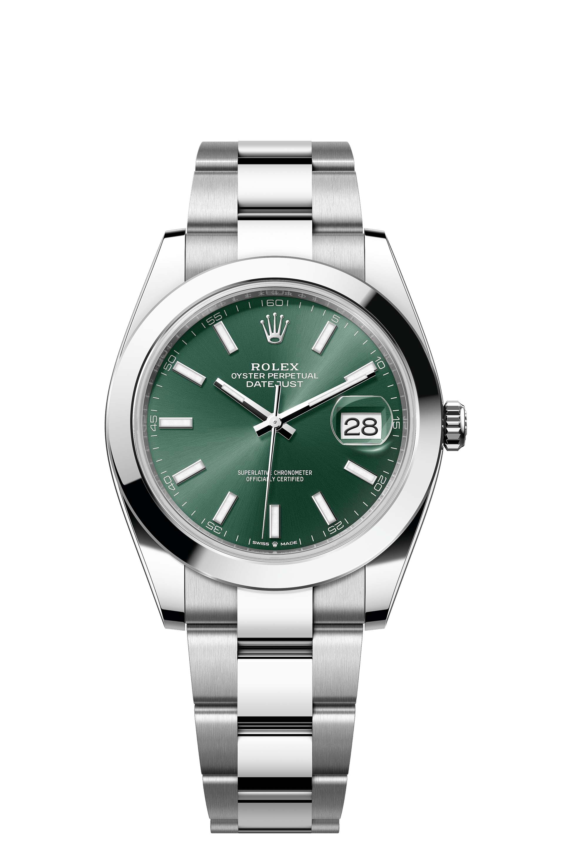 This Oyster Perpetual Datejust 41 in Oystersteel features a mint green dial and an Oyster bracelet.