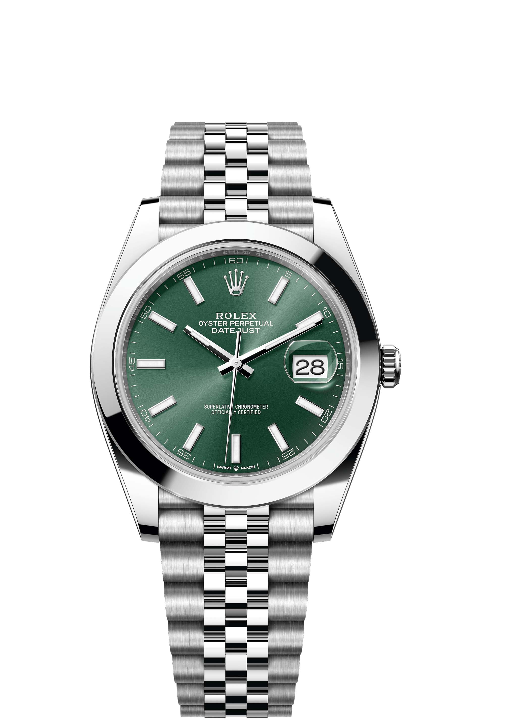 This Oyster Perpetual Datejust 41 in Oystersteel features a mint green dial and a Jubilee bracelet.
