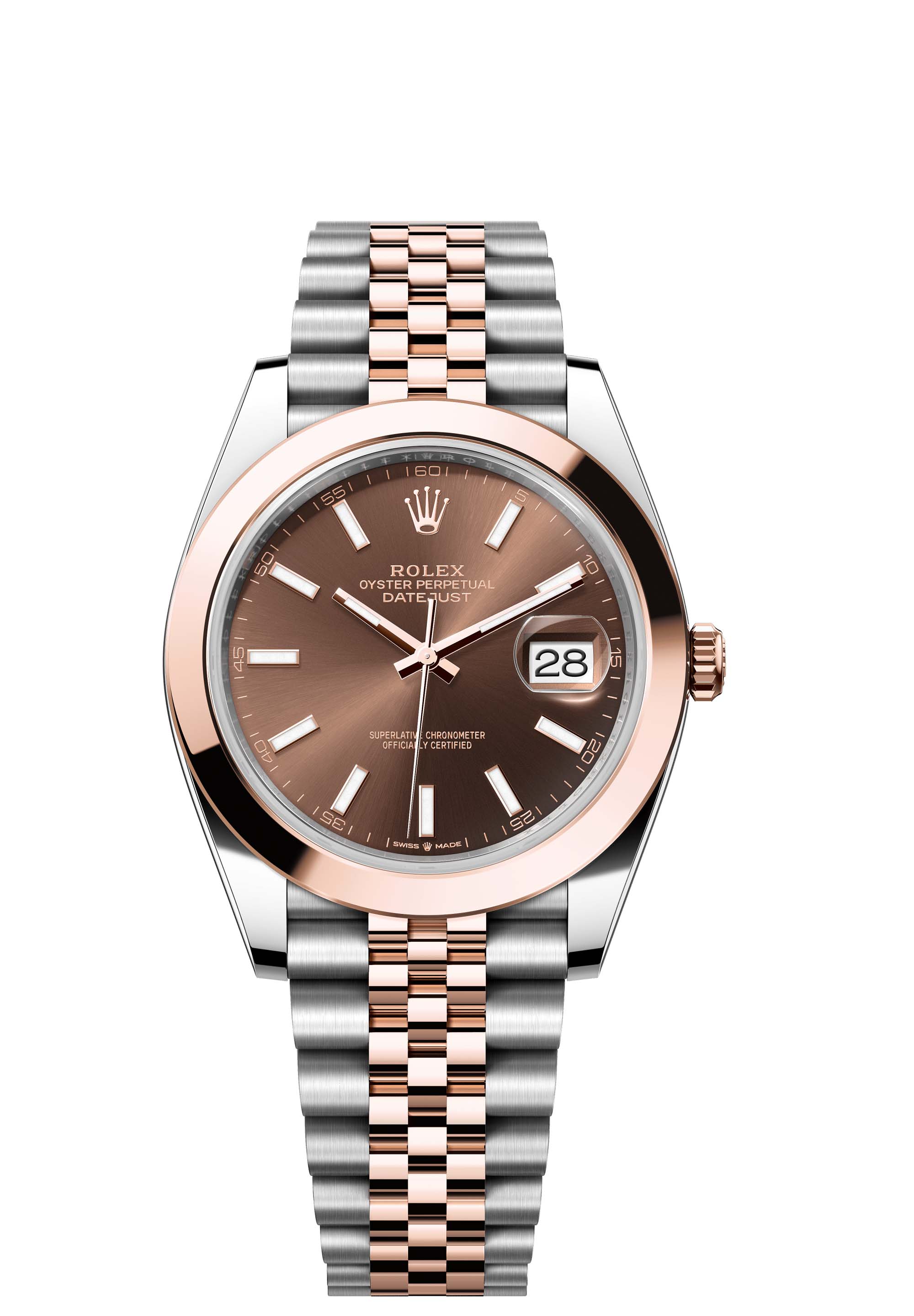 This Oyster Perpetual Datejust 41 in Oystersteel and Everose gold features a chocolate dial and a Jubilee bracelet.