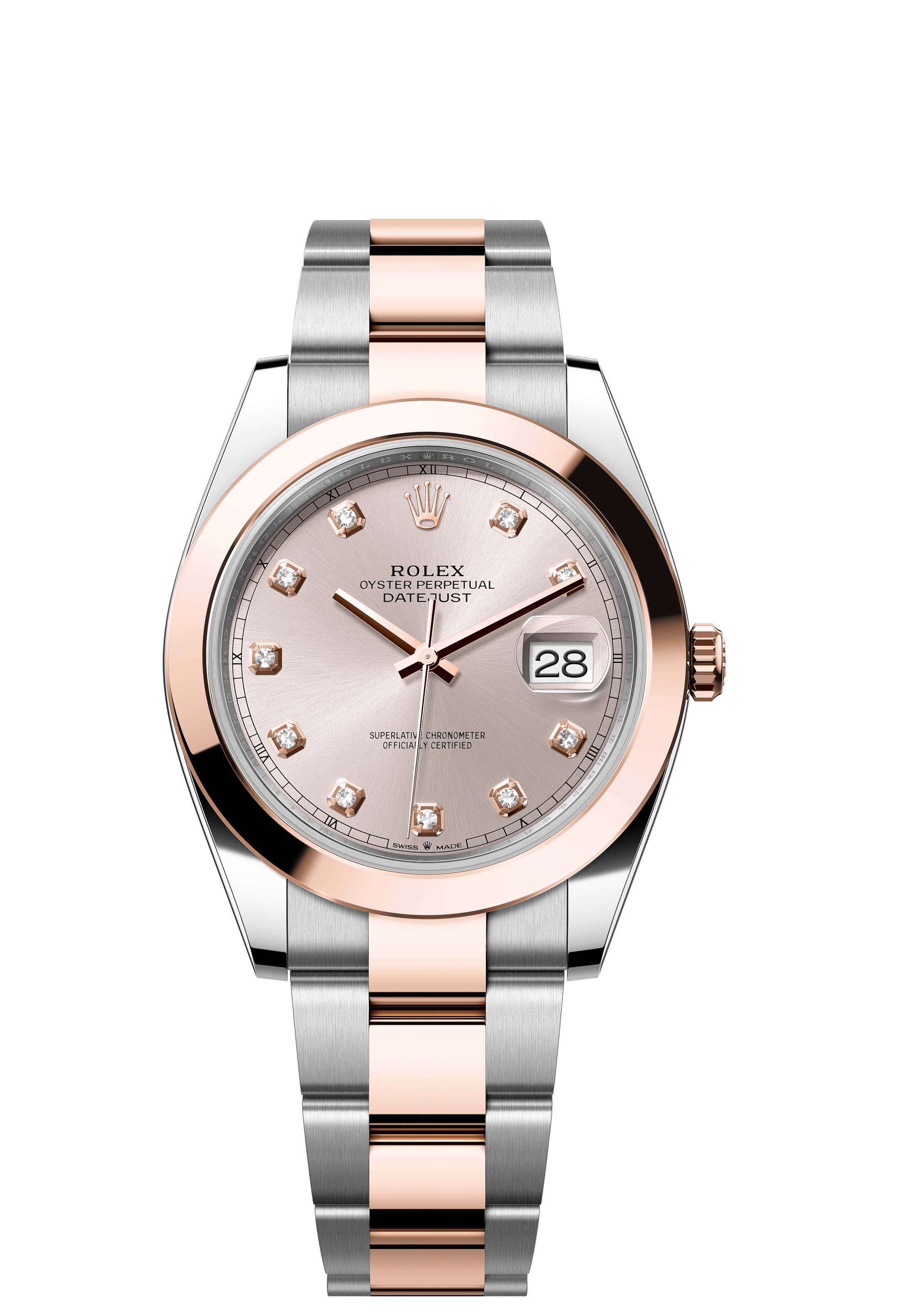 This Oyster Perpetual Datejust 41 in Oystersteel and Everose gold features a Sundust, diamond-set dial and an Oyster bracelet.