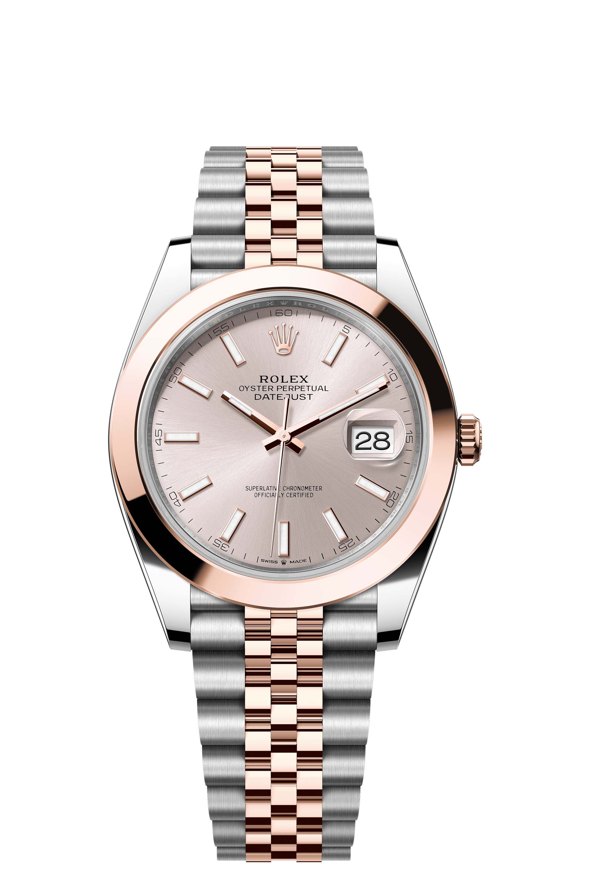 This Oyster Perpetual Datejust 41 in Oystersteel and Everose gold features a Sundust dial and a Jubilee bracelet.