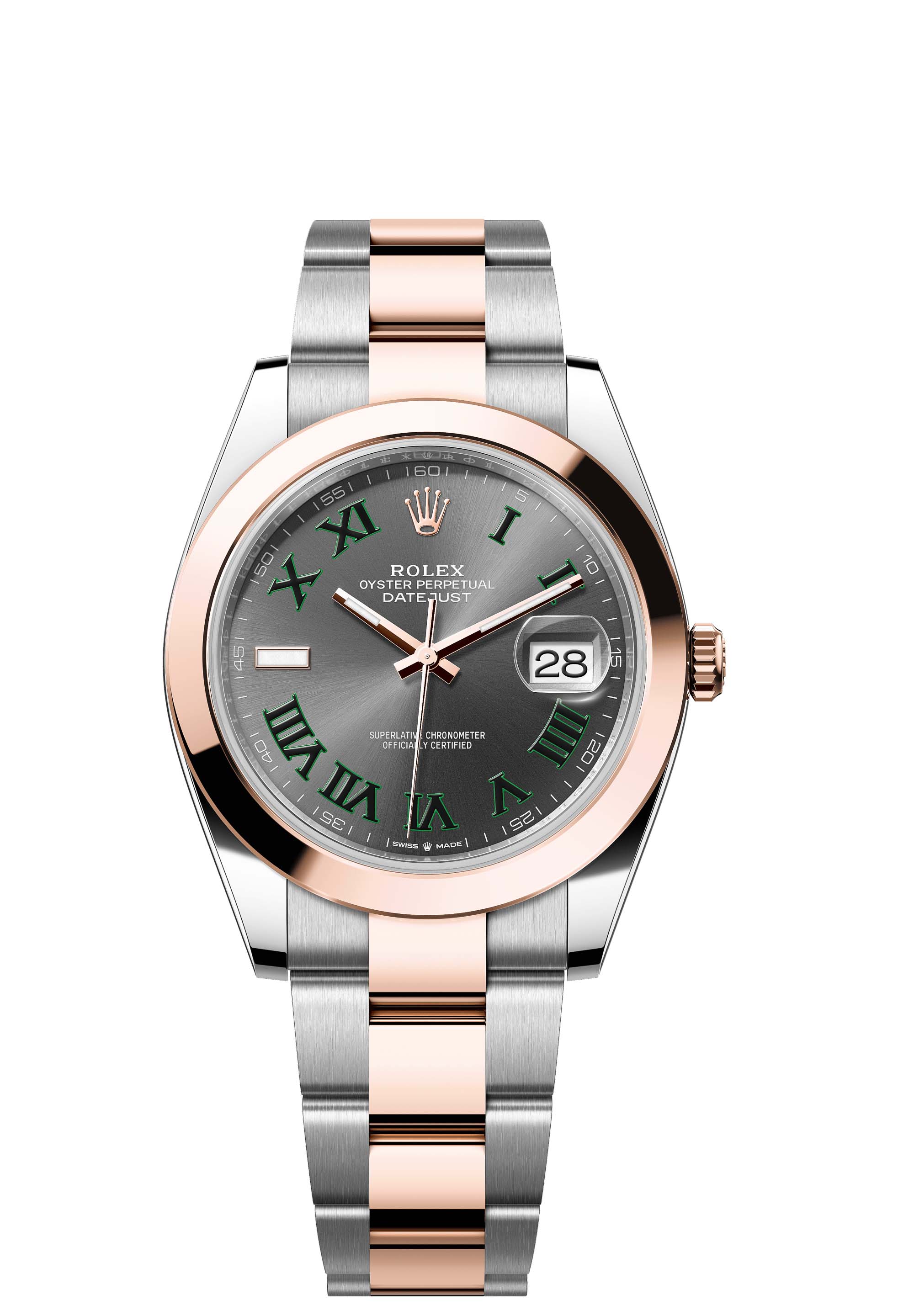 This Oyster Perpetual Datejust 41 in Oystersteel and Everose gold features a slate dial and an Oyster bracelet.