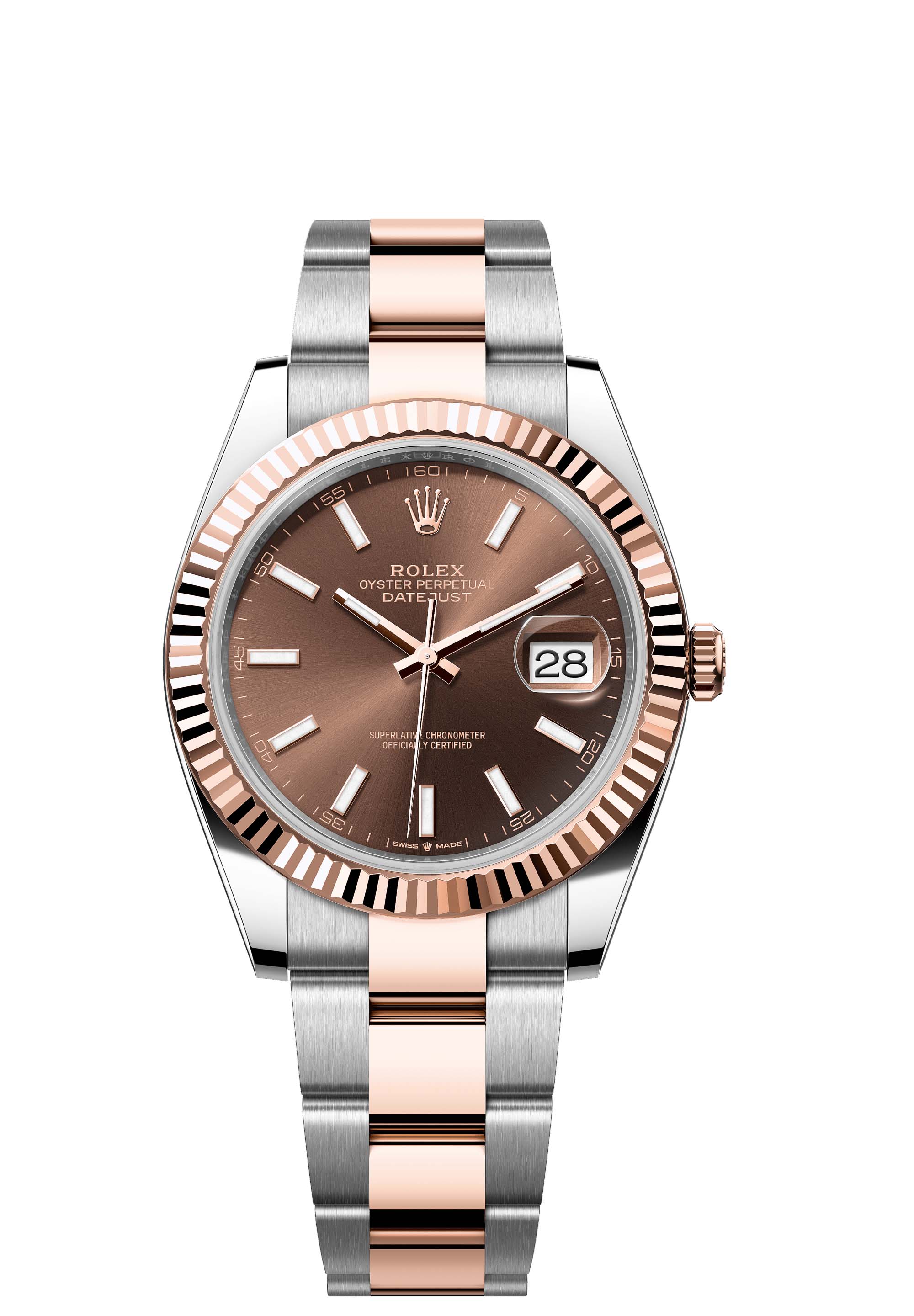 This Oyster Perpetual Datejust 41 in Oystersteel and Everose gold features a chocolate dial and an Oyster bracelet.