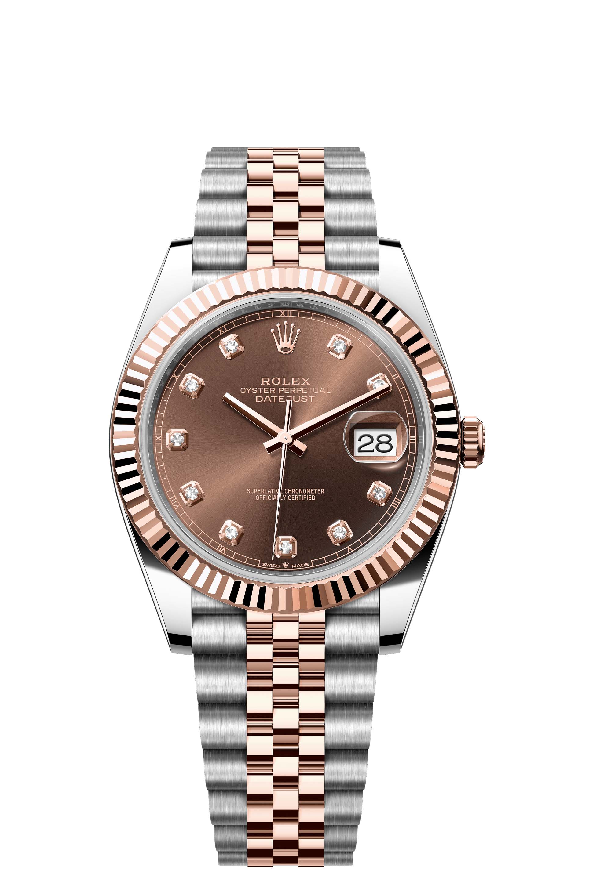 This Oyster Perpetual Datejust 41 in Oystersteel and Everose gold features a chocolate, diamond-set dial and a Jubilee bracelet.