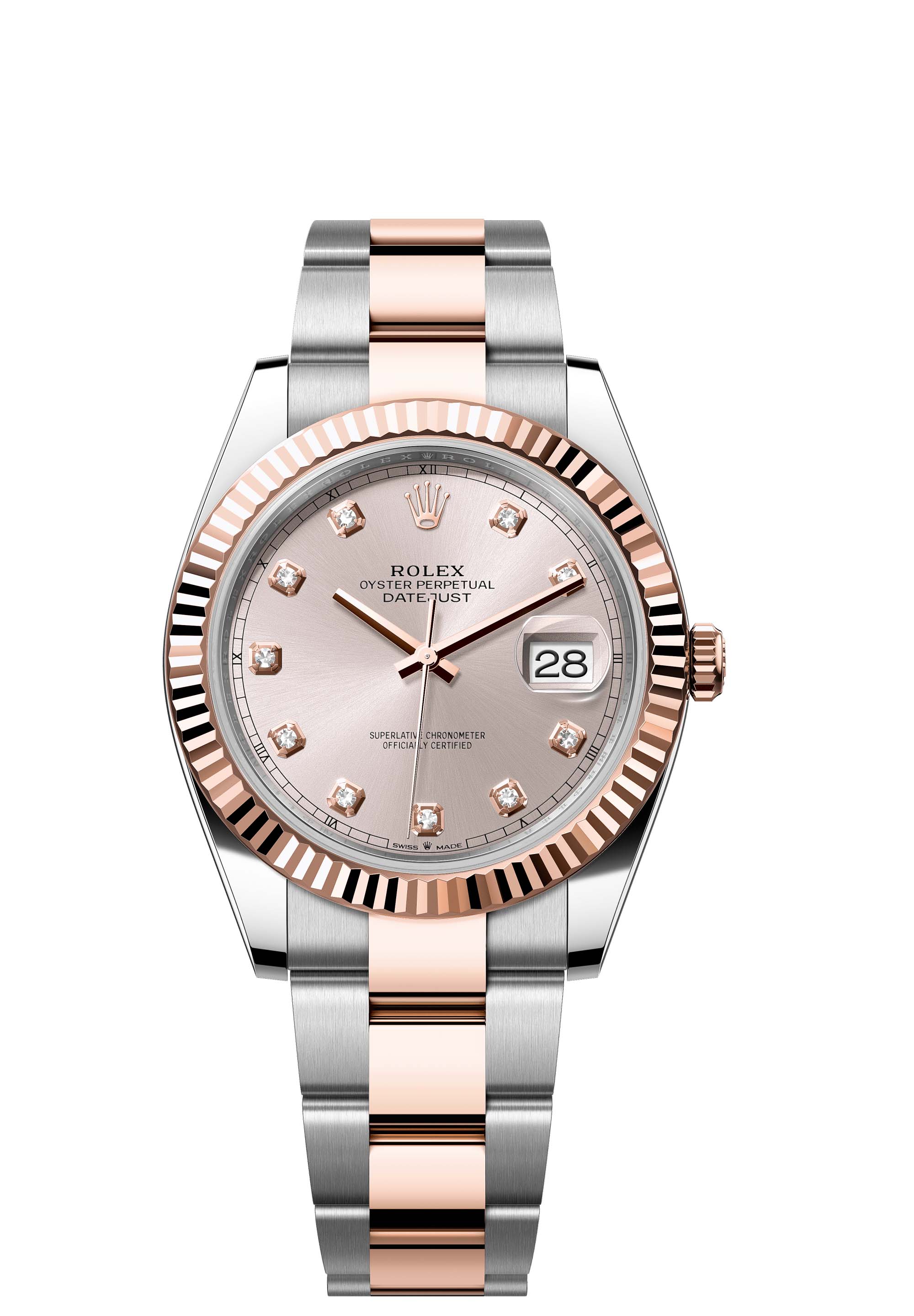 This Oyster Perpetual Datejust 41 in Oystersteel and Everose gold features a Sundust, diamond-set dial and an Oyster bracelet.