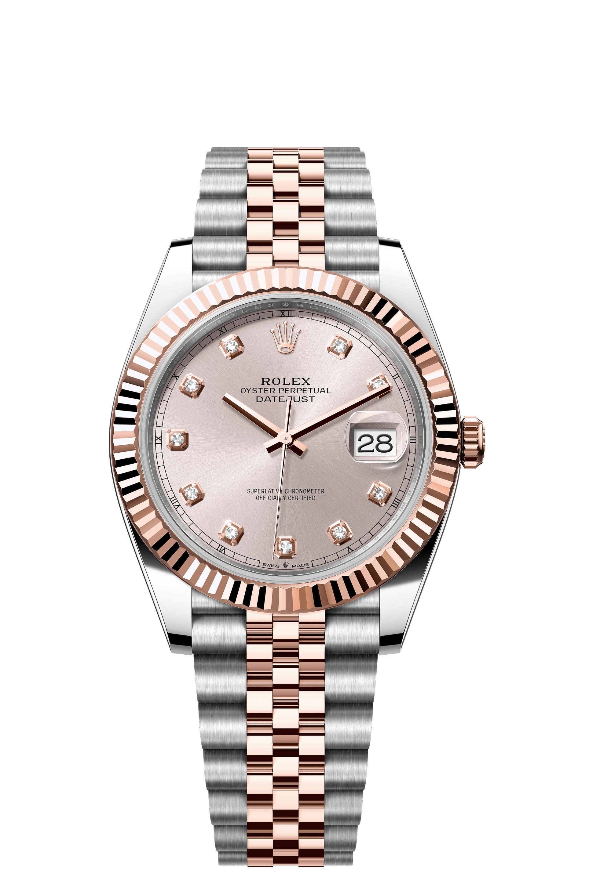 This Oyster Perpetual Datejust 41 in Oystersteel and Everose gold features a Sundust, diamond-set dial and a Jubilee bracelet.