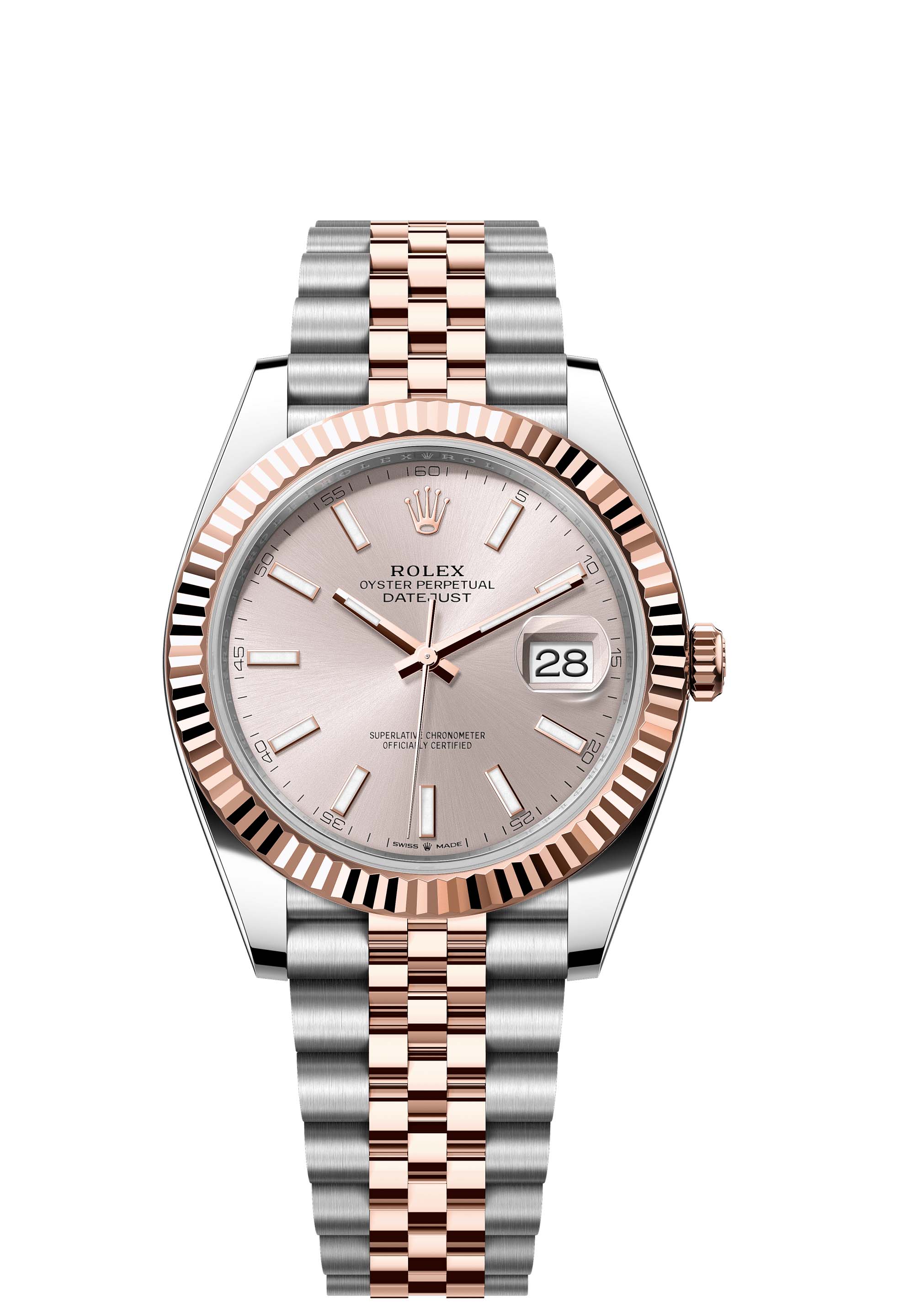 This Oyster Perpetual Datejust 41 in Oystersteel and Everose gold features a Sundust dial and a Jubilee bracelet.