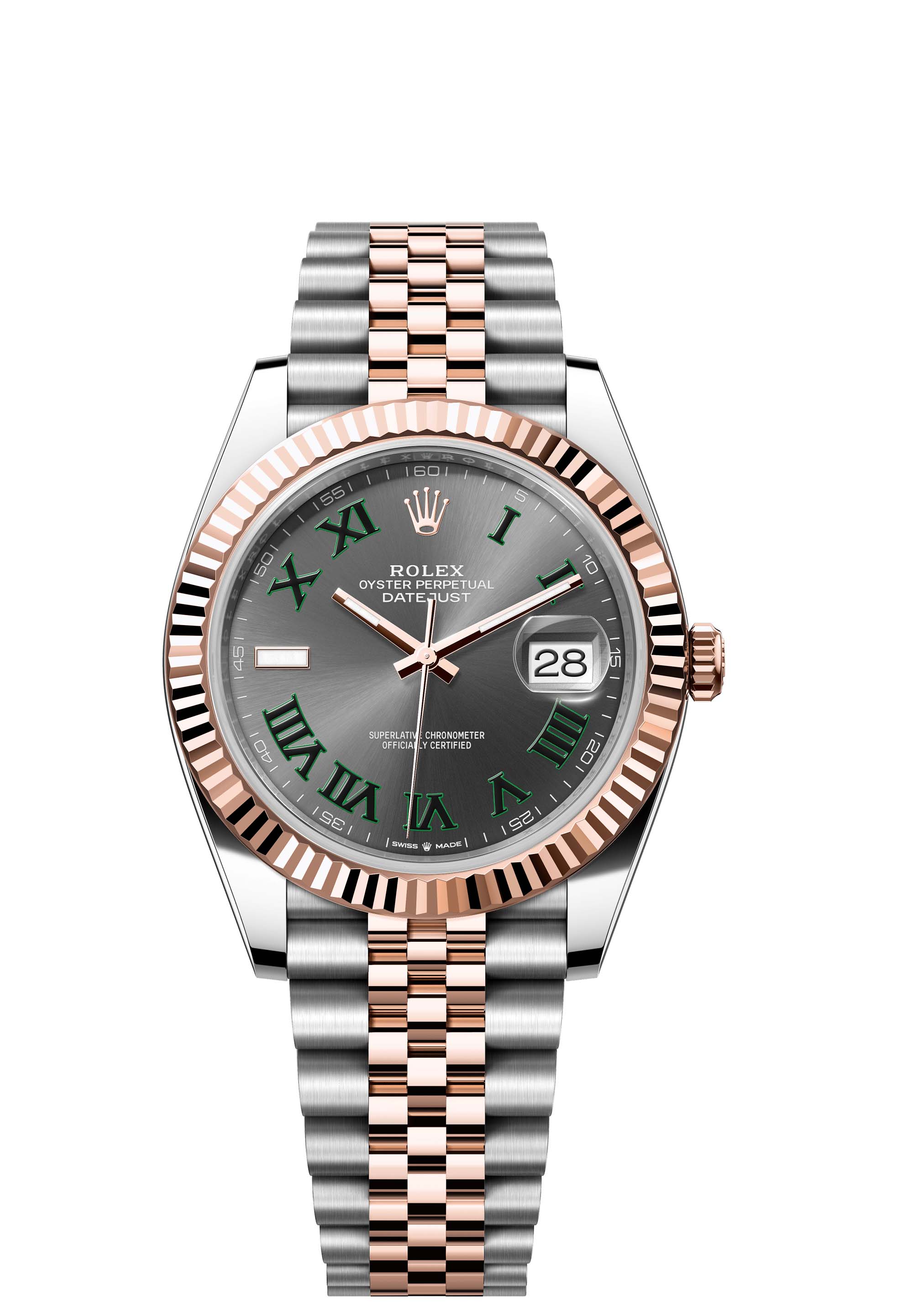 This Oyster Perpetual Datejust 41 in Oystersteel and Everose gold features a slate dial and a Jubilee bracelet.