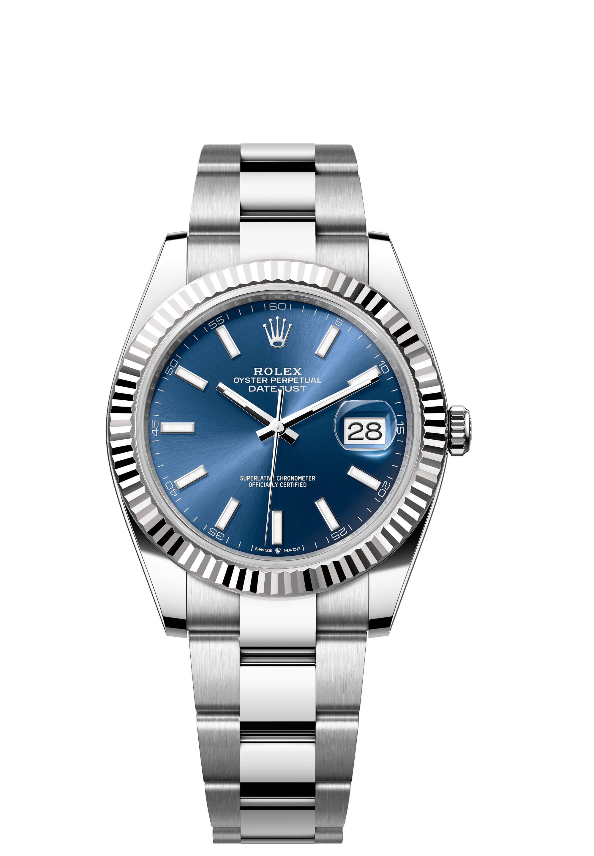 This Oyster Perpetual Datejust 41 in Oystersteel and white gold features a bright blue dial and an Oyster bracelet.