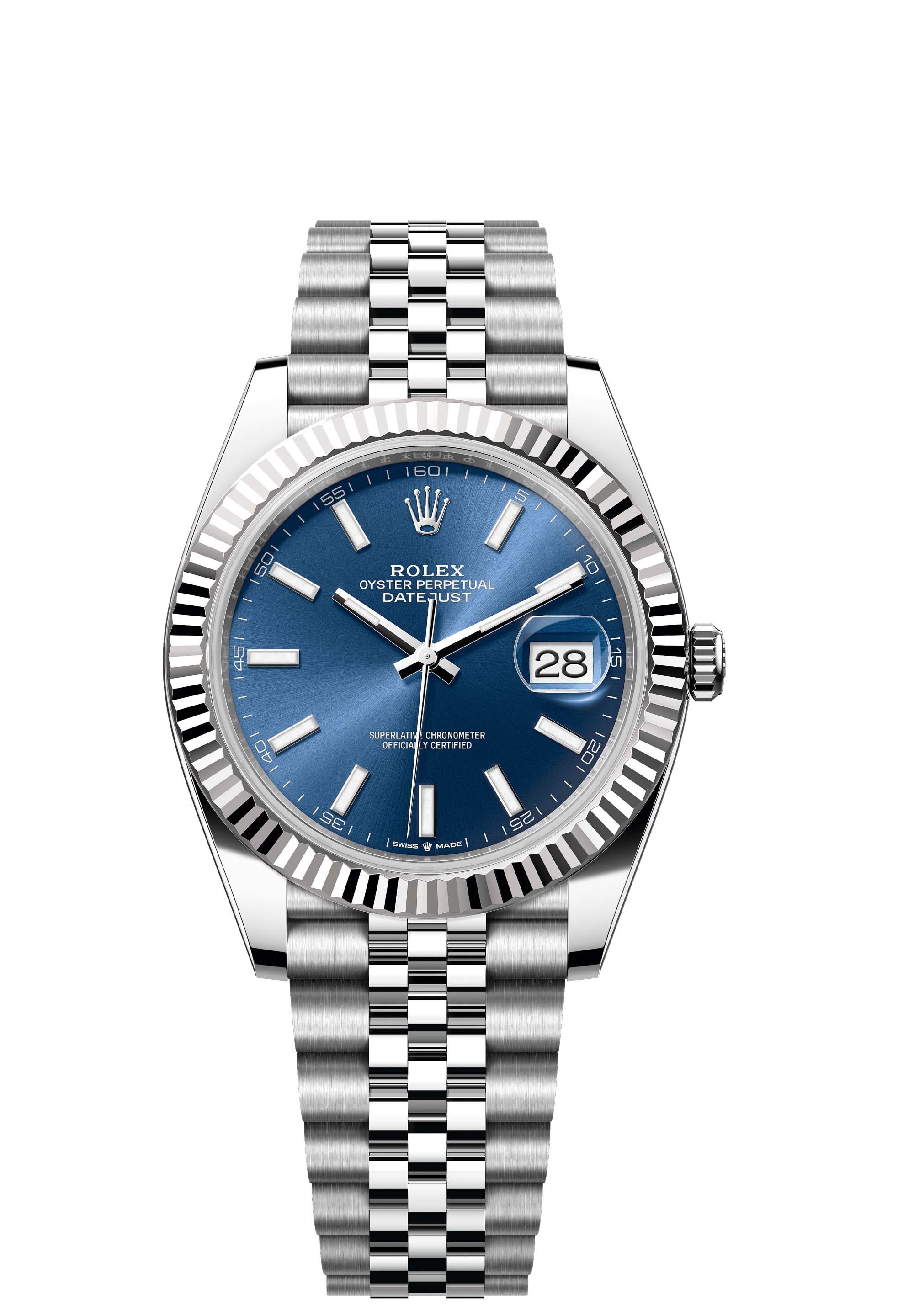 This Oyster Perpetual Datejust 41 in Oystersteel and white gold features a bright blue dial and a Jubilee bracelet.