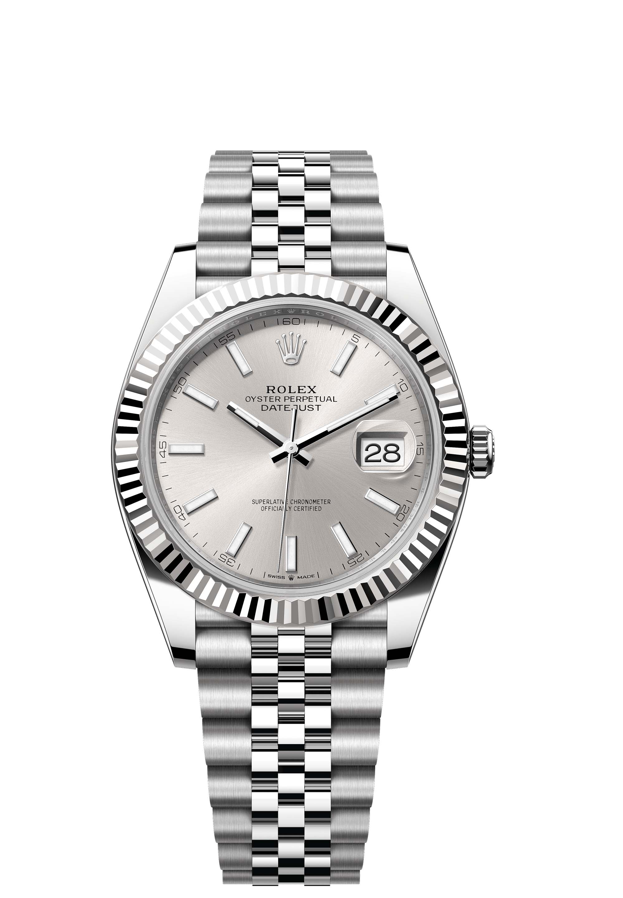 This Oyster Perpetual Datejust 41 in Oystersteel and white gold features a silver dial and a Jubilee bracelet.