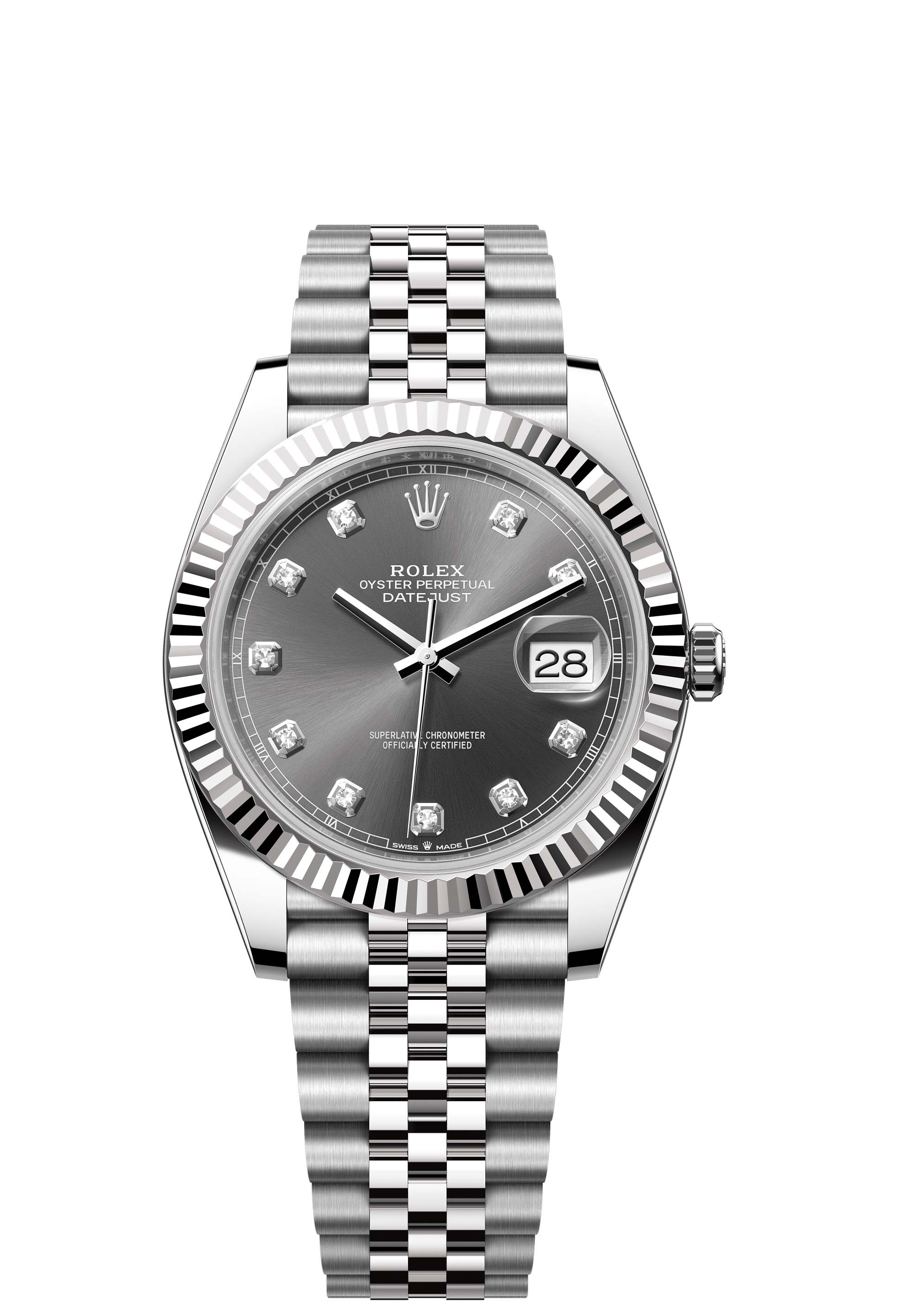 This Oyster Perpetual Datejust 41 in Oystersteel and white gold features a slate, diamond-set dial and a Jubilee bracelet.