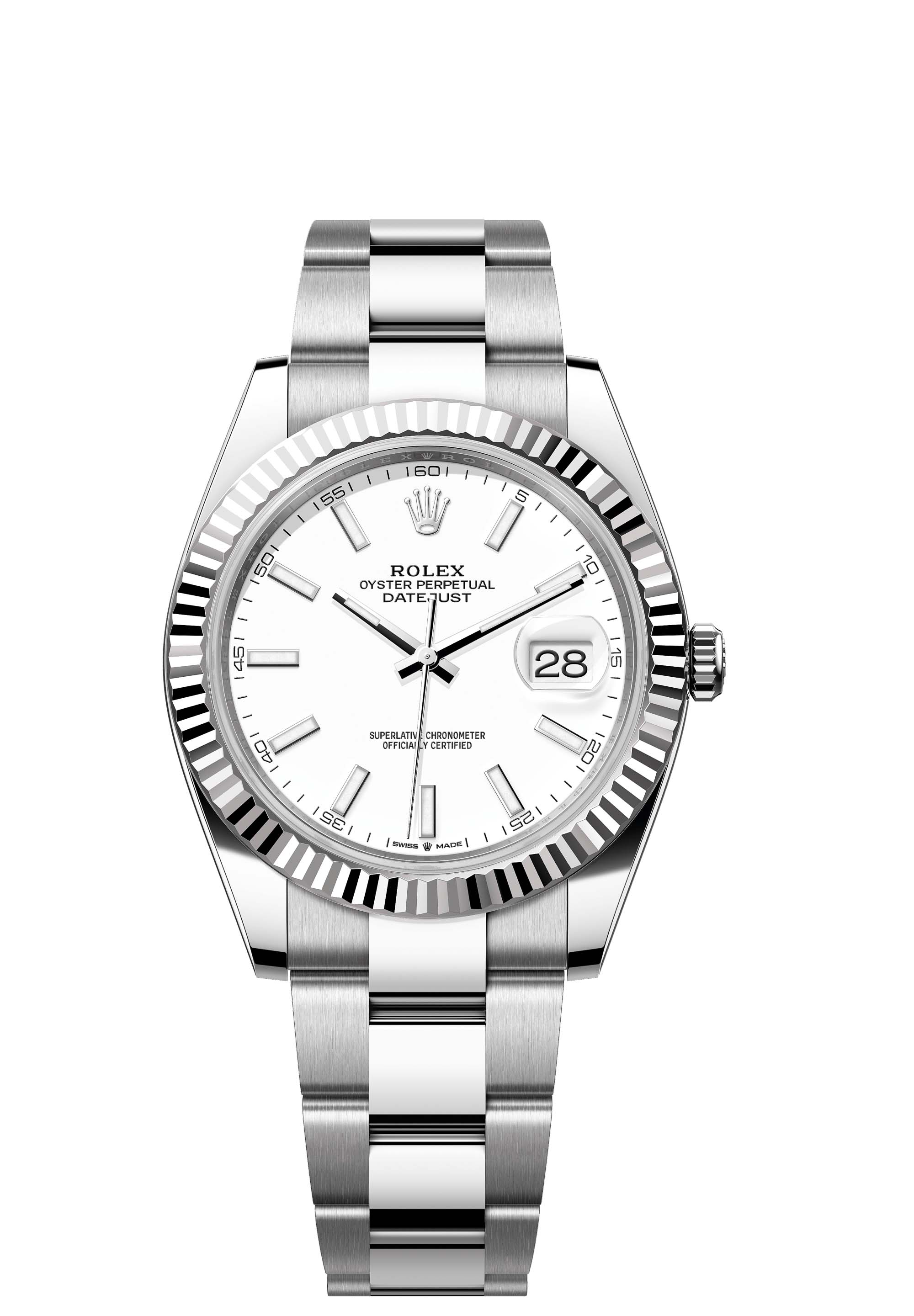 This Oyster Perpetual Datejust 41 in Oystersteel and white gold features a white dial and an Oyster bracelet.