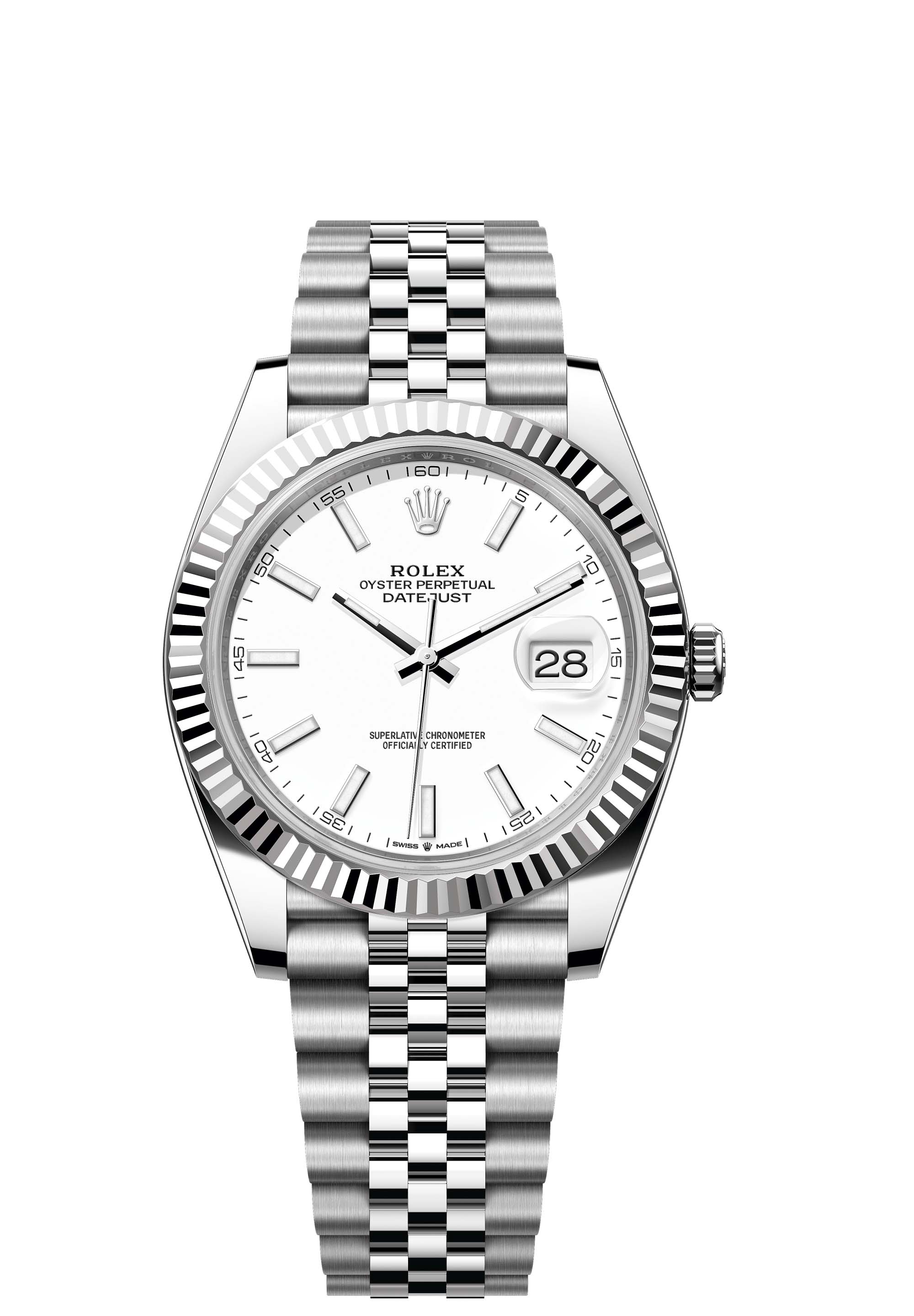 This Oyster Perpetual Datejust 41 in Oystersteel and white gold features a white dial and a Jubilee bracelet.