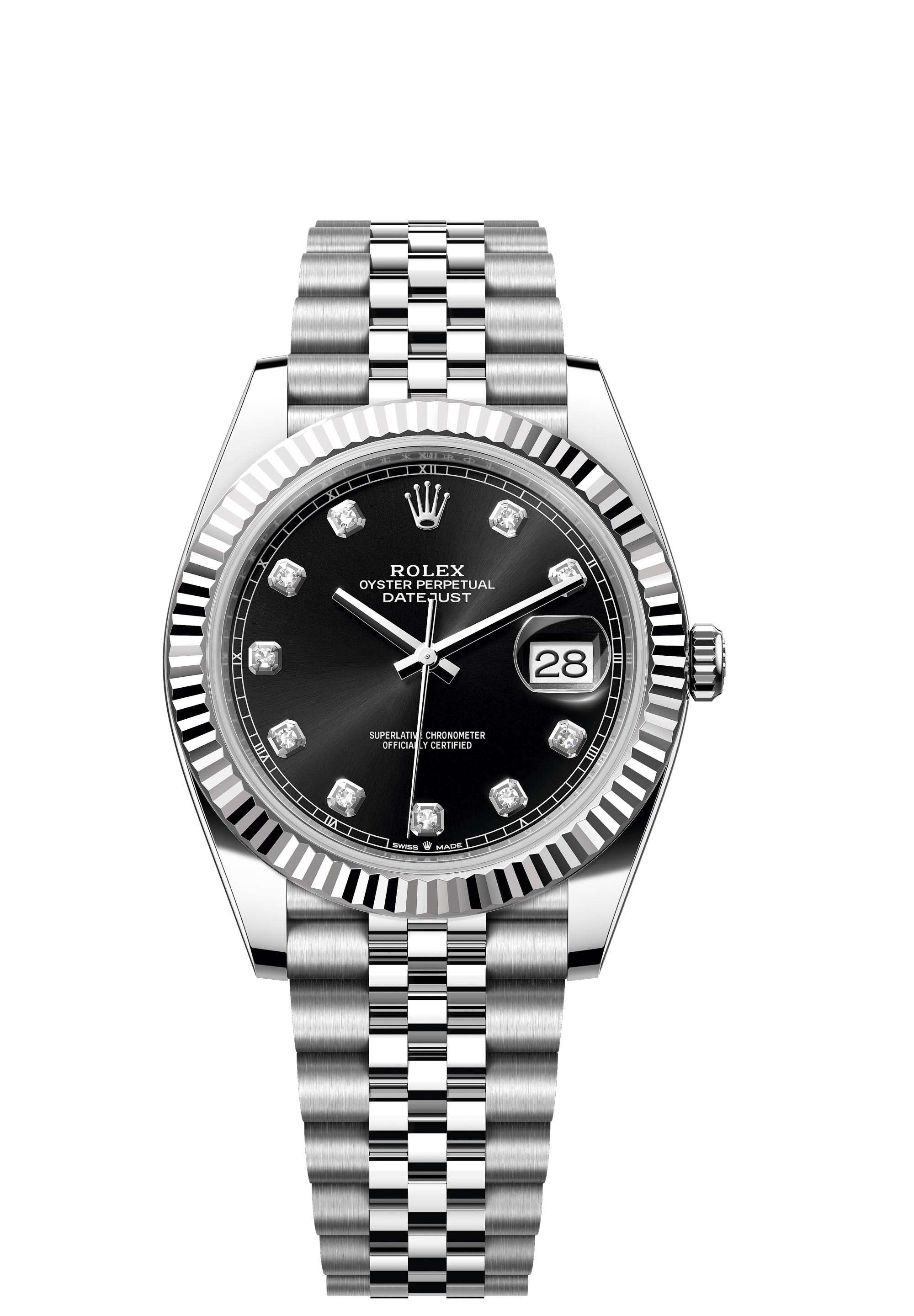 This Oyster Perpetual Datejust 41 in Oystersteel and white gold features a bright black, diamond-set dial and a Jubilee bracelet.