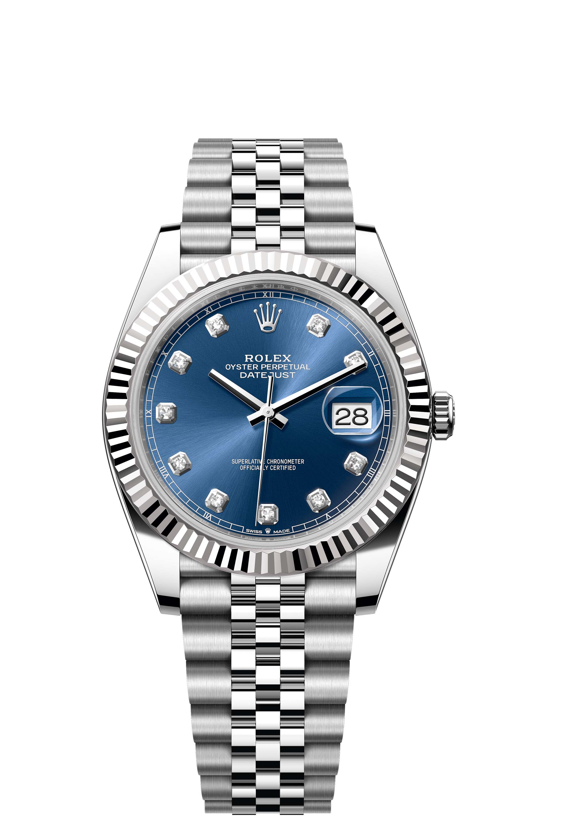 This Oyster Perpetual Datejust 41 in Oystersteel and white gold features a bright blue, diamond-set dial and a Jubilee bracelet.