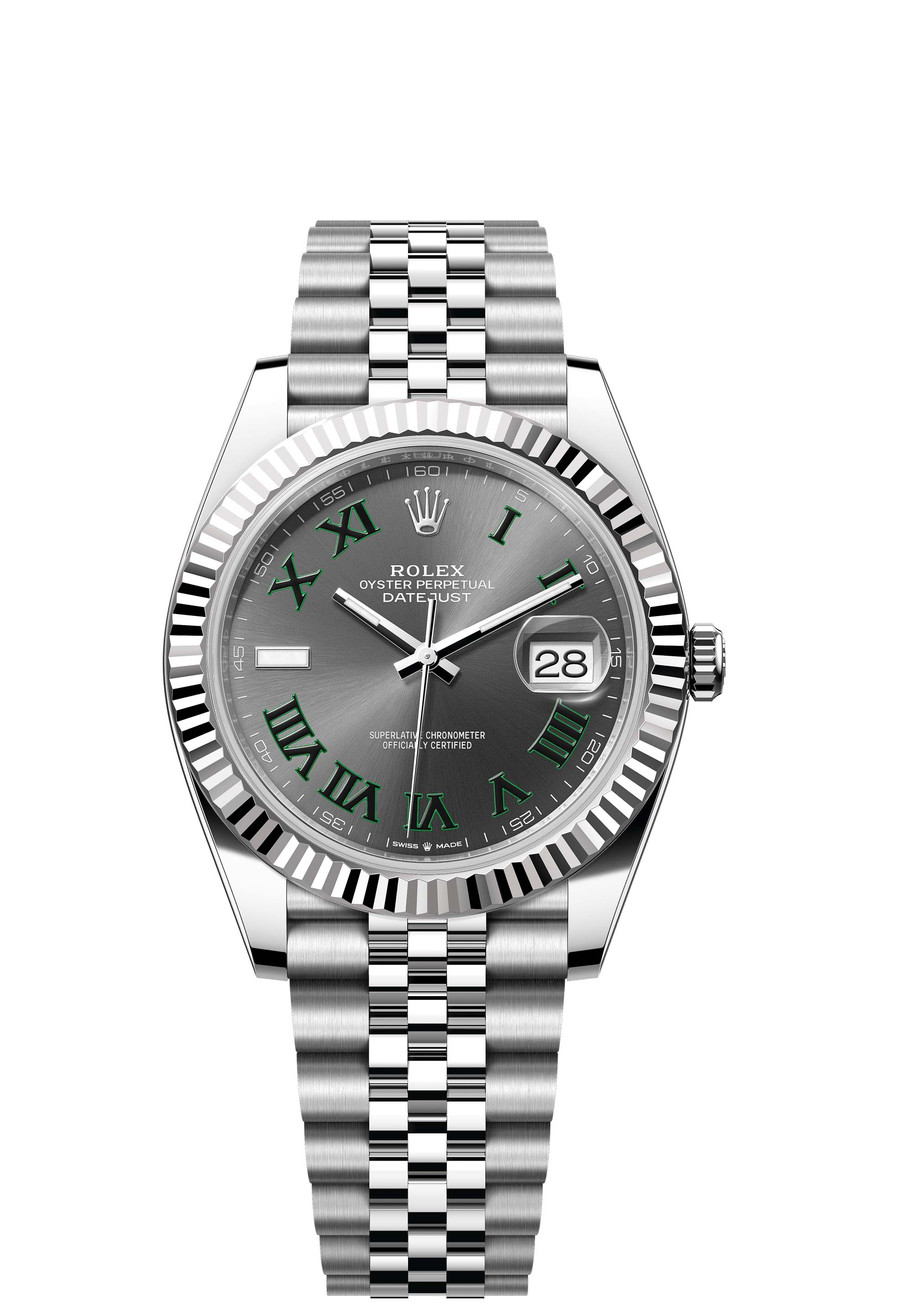 This Oyster Perpetual Datejust 41 in Oystersteel and white gold features a slate dial and a Jubilee bracelet.