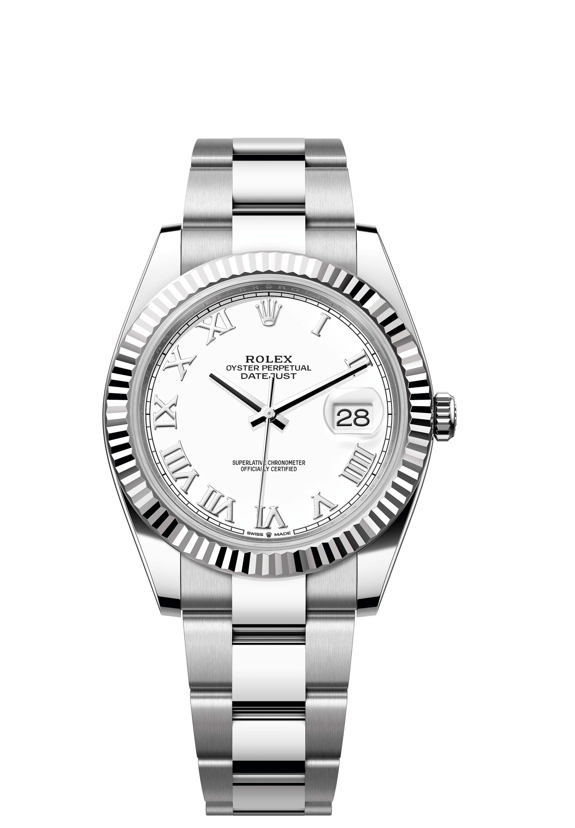 This Oyster Perpetual Datejust 41 in Oystersteel and white gold features a white dial and an Oyster bracelet.