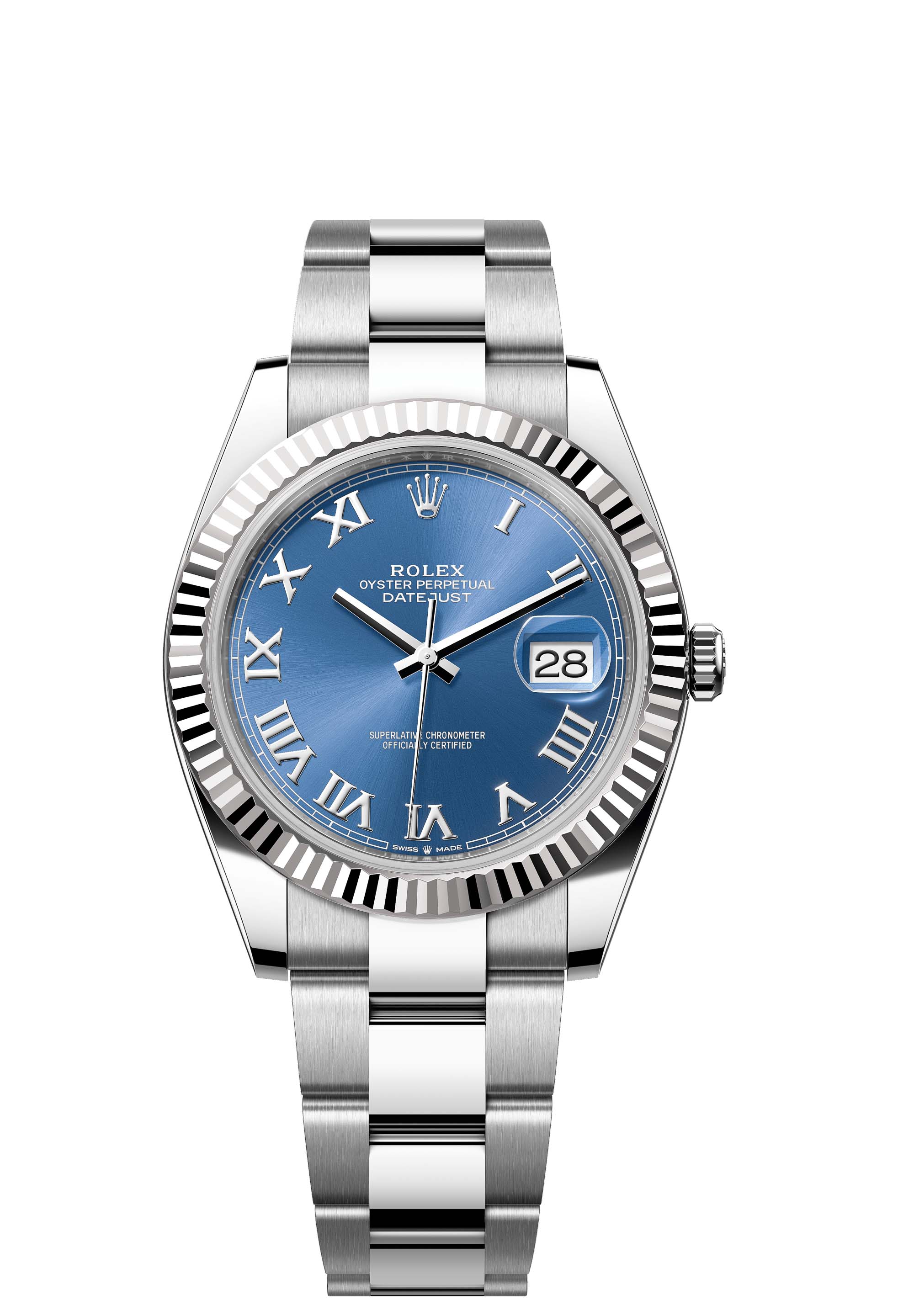 This Oyster Perpetual Datejust 41 in Oystersteel and white gold features an azzurro-blue dial and an Oyster bracelet.