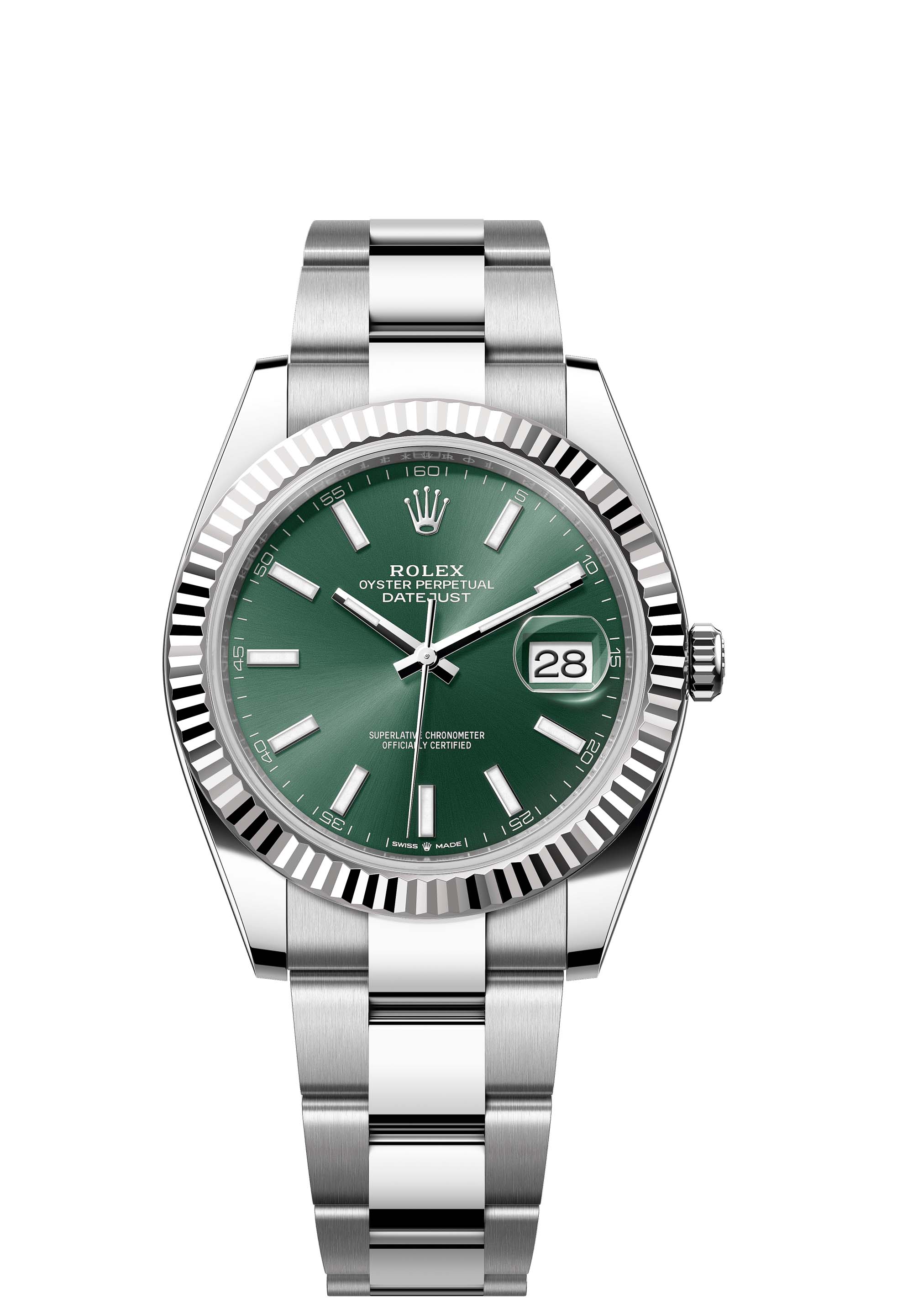 This Oyster Perpetual Datejust 41 in Oystersteel and white gold features a mint green dial and an Oyster bracelet.