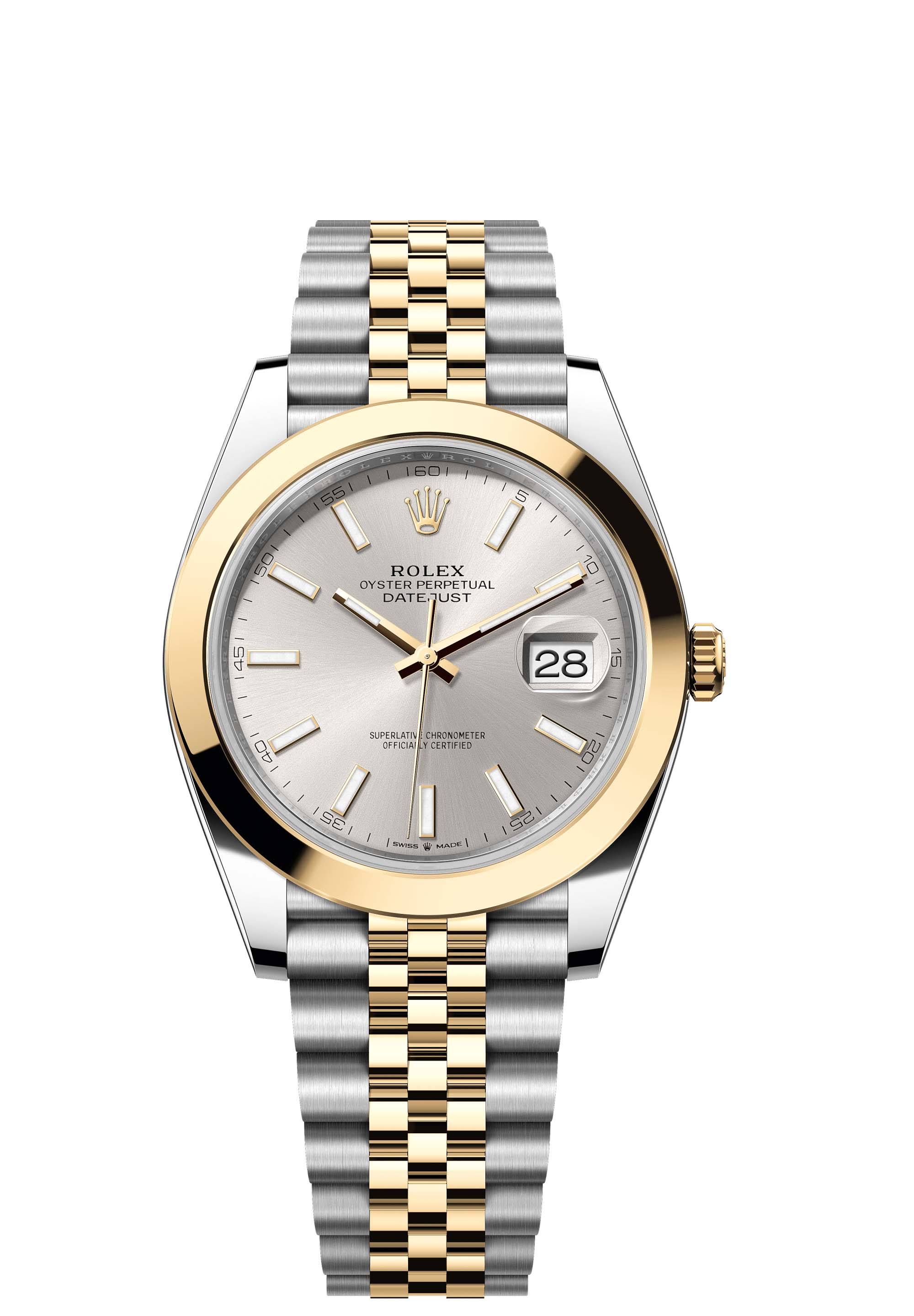 This Oyster Perpetual Datejust 41 in Oystersteel and yellow gold features a silver dial and a Jubilee bracelet.