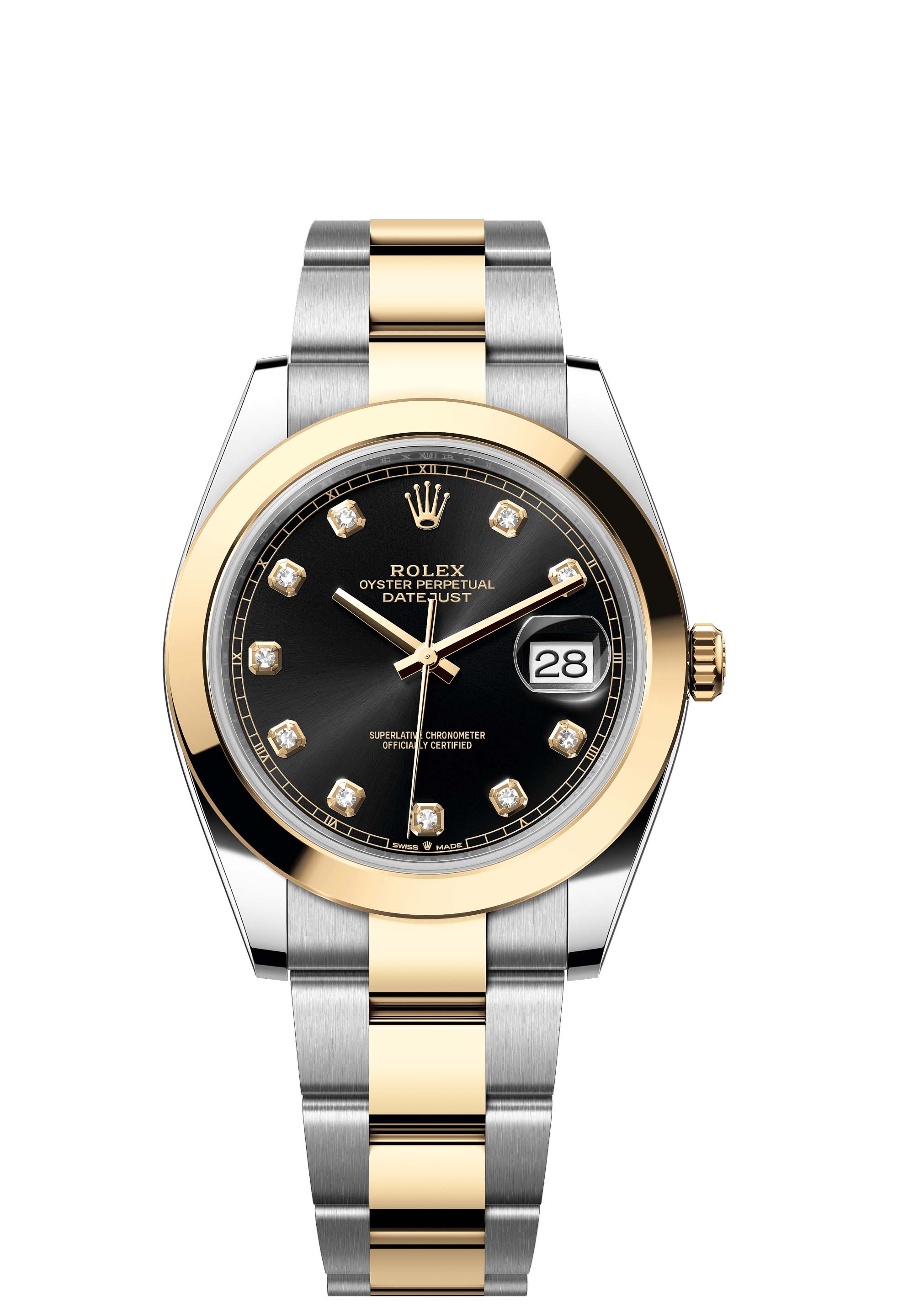 This Oyster Perpetual Datejust 41 in Oystersteel and yellow gold features a bright black, diamond-set dial and an Oyster bracelet.